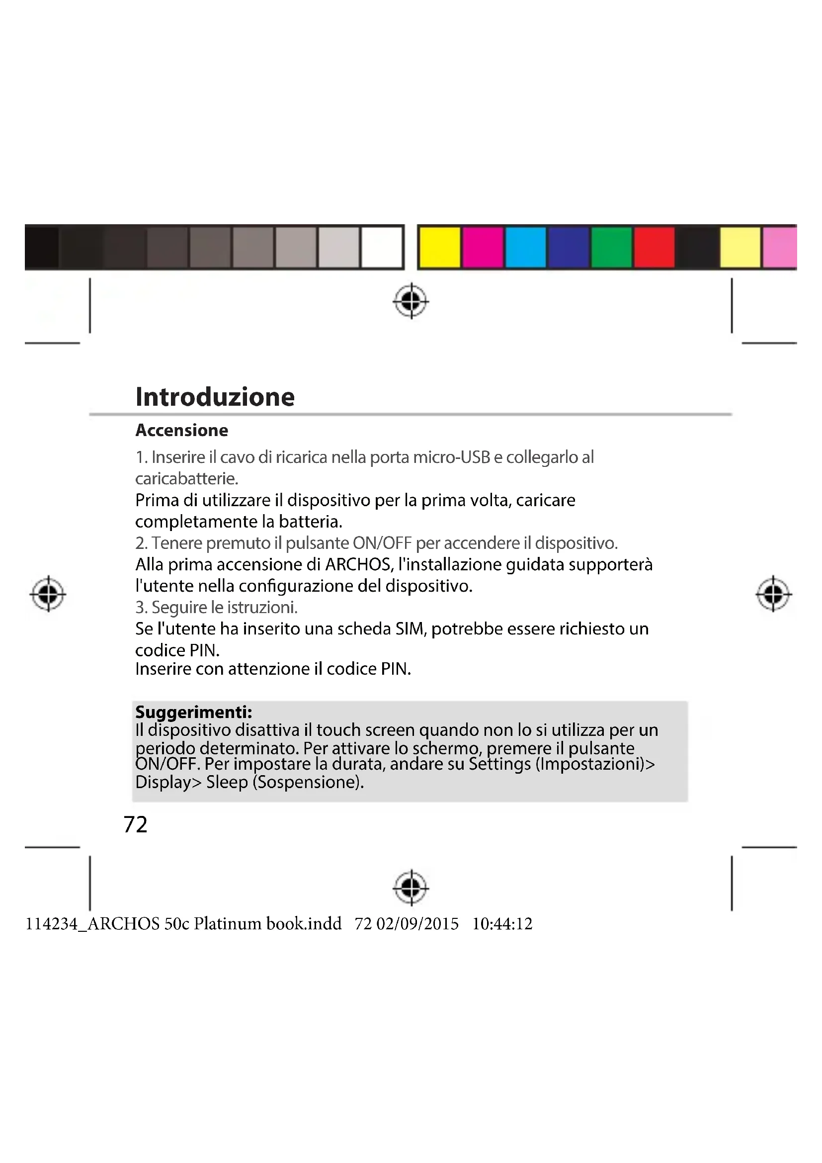 Italiano Sollevare la copertura posteriore facendo leva sulla tacca 114234_ARCHOS 50c Platinum book.indd 71 02/09/2015 10:44:1272 Suggerimenti: Il dispositivo disattiva il touch screen quando non lo si utilizza per un periodo determinato. Per attivare lo schermo, premere il pulsante ON/OFF. Per impostare la durata, andare su Settings (Impostazioni)> Display> Sleep (Sospensione). Accensione