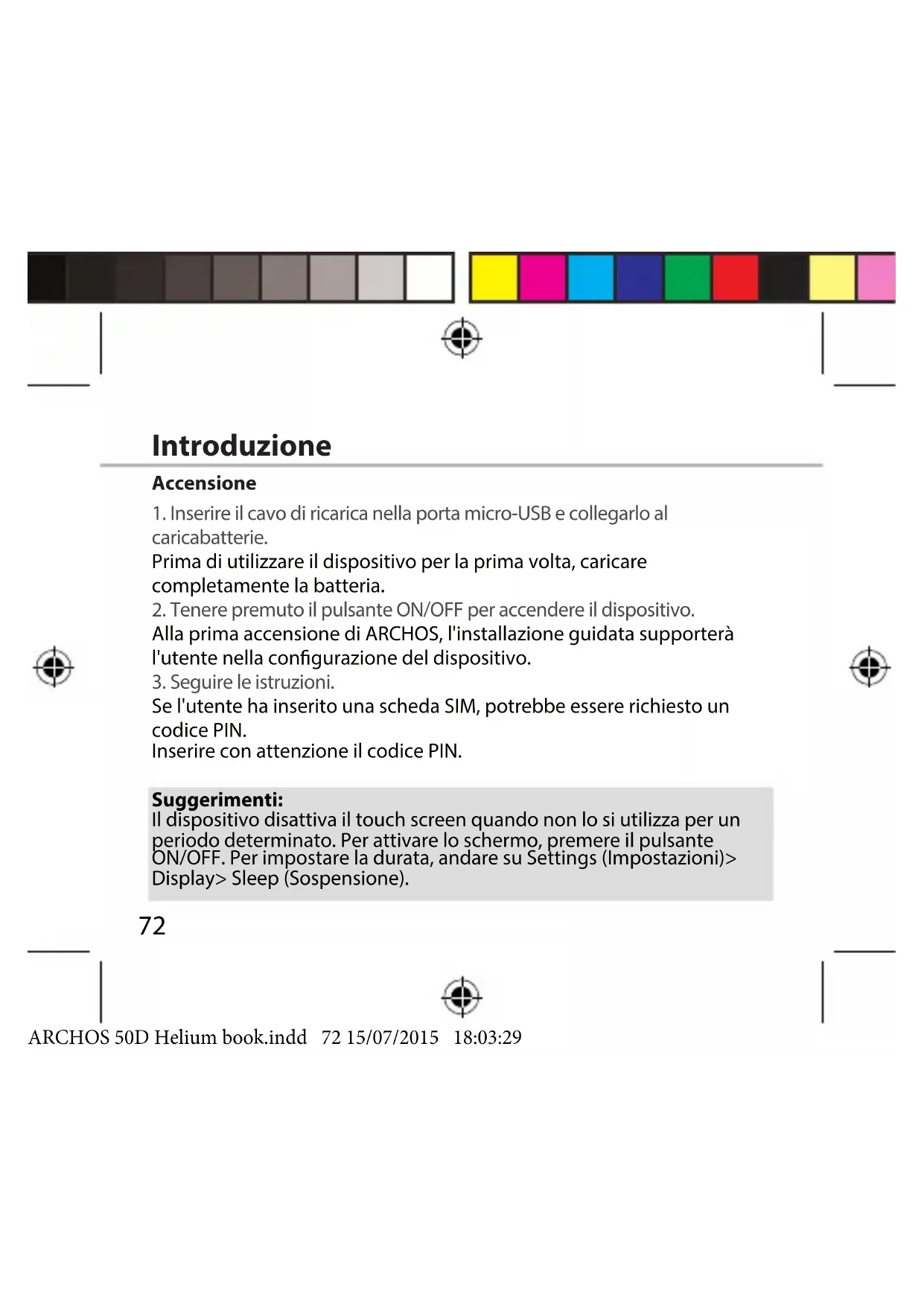 Se l'utente ha inserito una scheda SIM, potrebbe essere richiesto un codice PIN. Inserire con attenzione il codice PIN. Introduzione ARCHOS 50D Helium book.indd 72 15/07/2015 18:03:2973