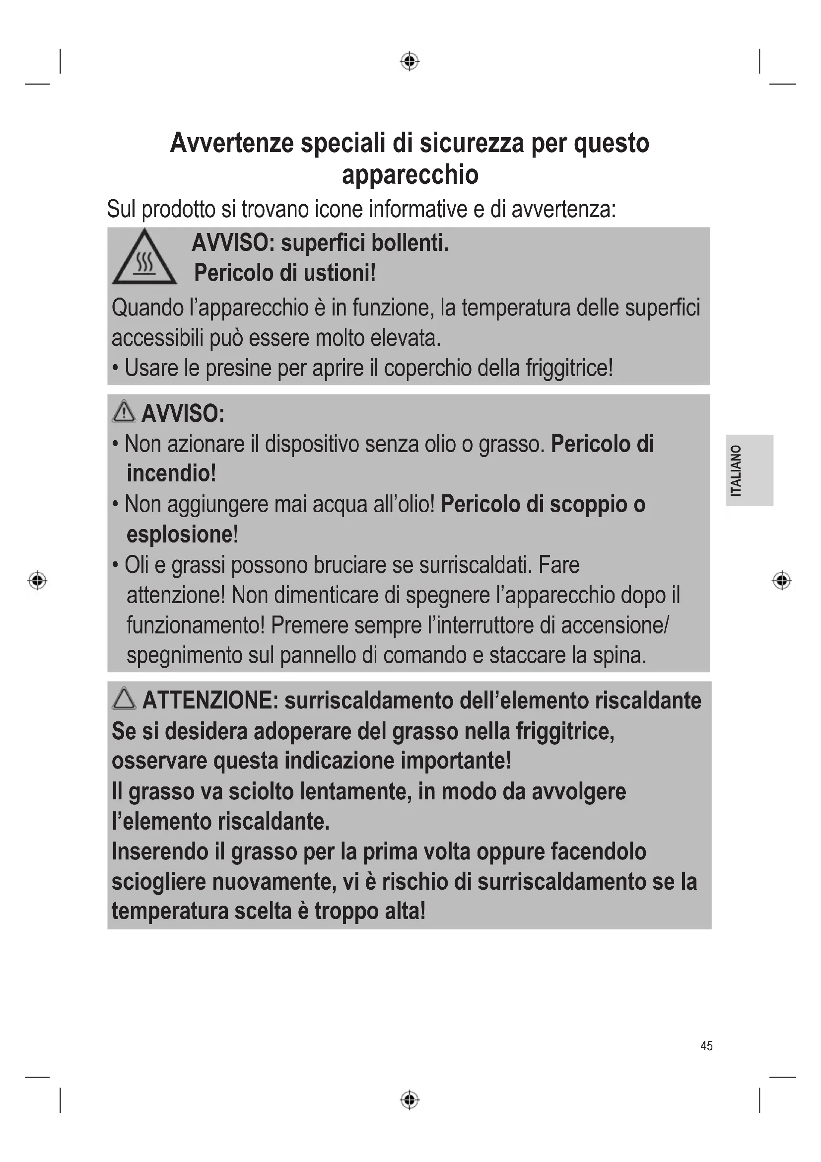 - Perragionidisicurezzatenerequalsiasi partedell’imballaggio(bustediplastica, cartone,polistirolo,ecc.)fuoridallaportata deibambini. AVVISO: Nonlasciaregiocareibambinipiccoliconla pellicola, pericolo di soffocamento! Osservareleseguenti“Avvertenzespecialidisi- curezza”.45 ITALIANO Avvertenze speciali di sicurezza per questo apparecchio Sulprodottositrovanoiconeinformativeediavvertenza: AVVISO: superci bollenti. Pericolo di ustioni! Quandol’apparecchioèinfunzione,latemperaturadellesuperci accessibilipuòesseremoltoelevata.