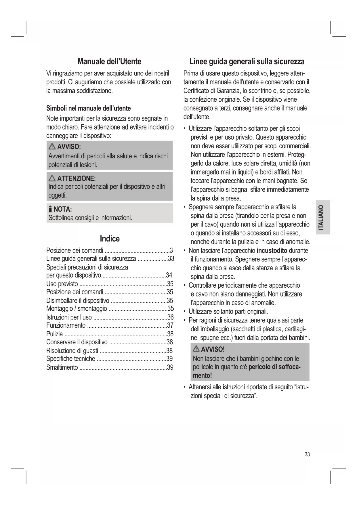 - Tenere apparecchio e relativo cavo di alimentazione lontani dalla portata dei bambini.