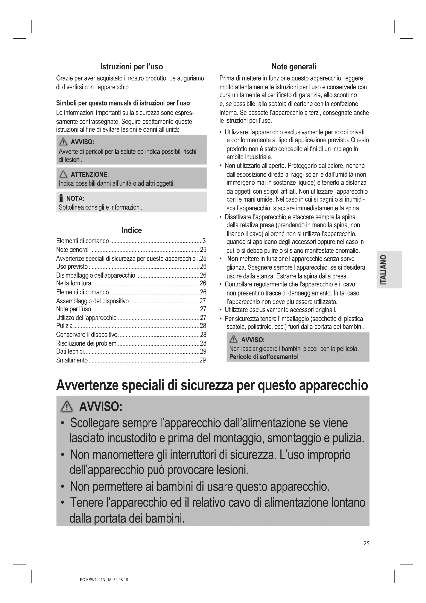 - Note generali Avvertenze speciali di sicurezza per questo apparecchio p. 25