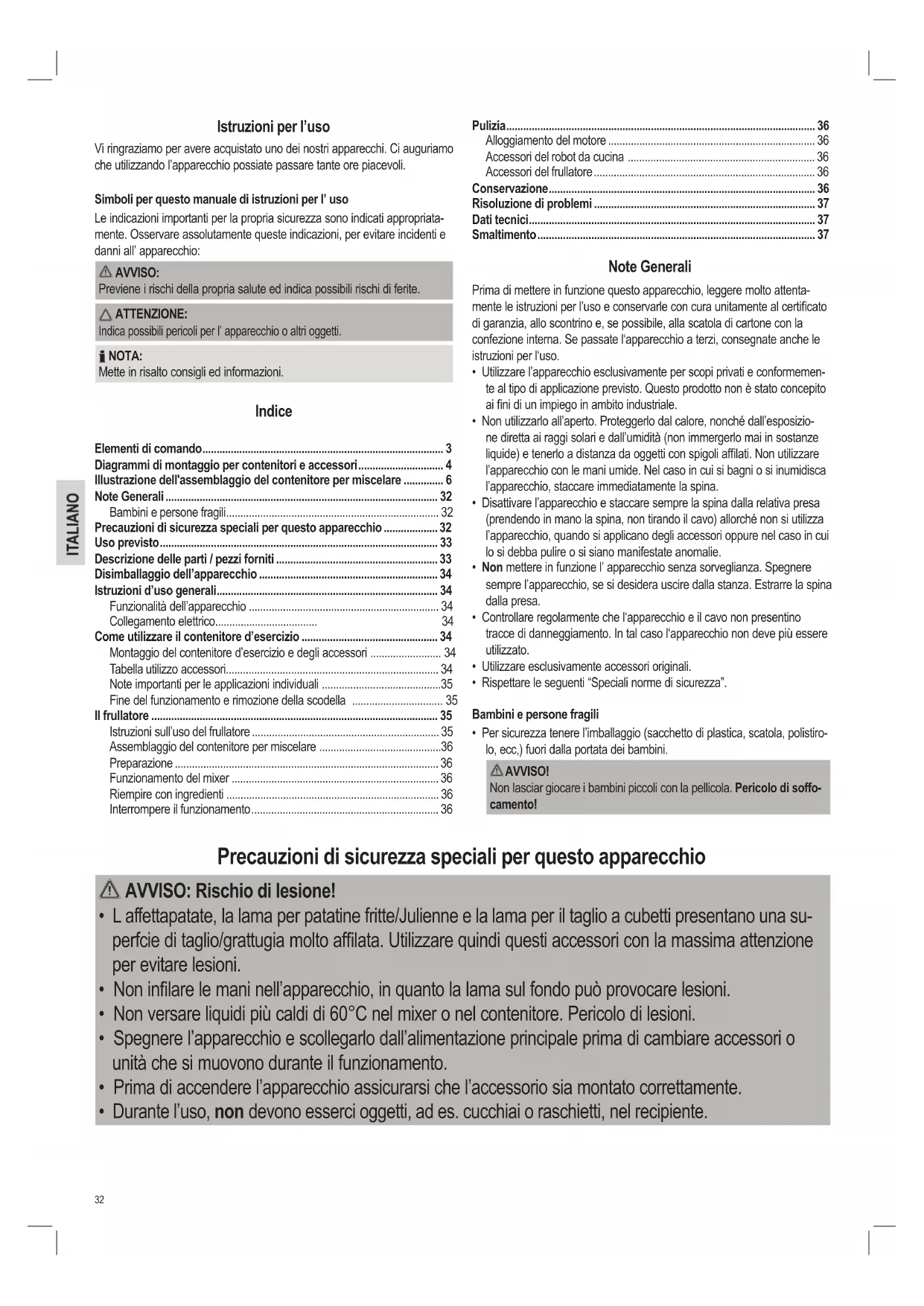 - Pulire l’alloggiamento solo con un panno umido e uno spruzzo di detersi- vo liquido. Asciugare con un panno. Accessori del robot da cucina AVVISO: Pericolo di lesion! Alcune parti degli accessori sono molto afliate! ATTENZIONE: