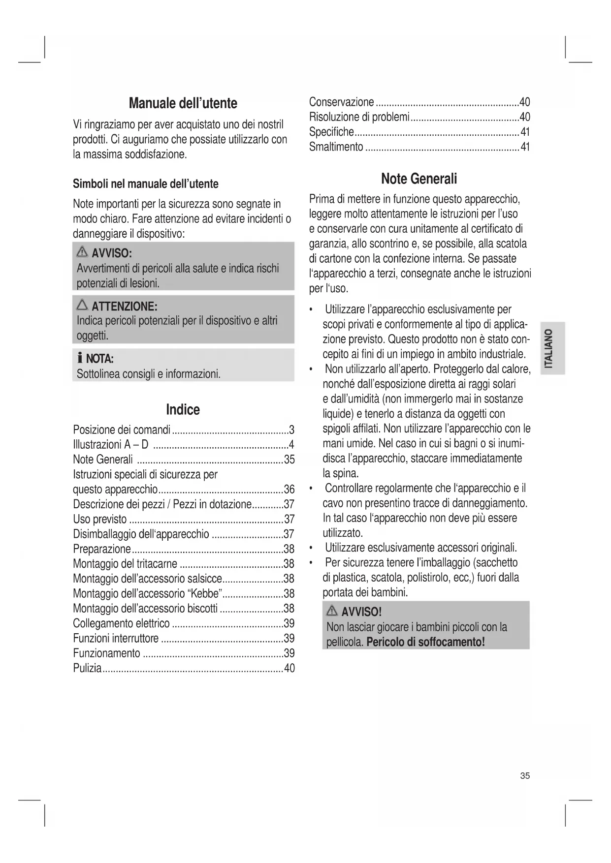 - Persicurezzatenerel’imballaggio(sacchetto di plastica, scatola, polistirolo, ecc,) fuori dalla portata dei bambini. AVVISO! Non lasciar giocare i bambini piccoli con la pellicola. Pericolo di soffocamento!36 Istruzioni speciali di sicurezza per questo apparecchio AVVISO: Pericolo di lesioni!