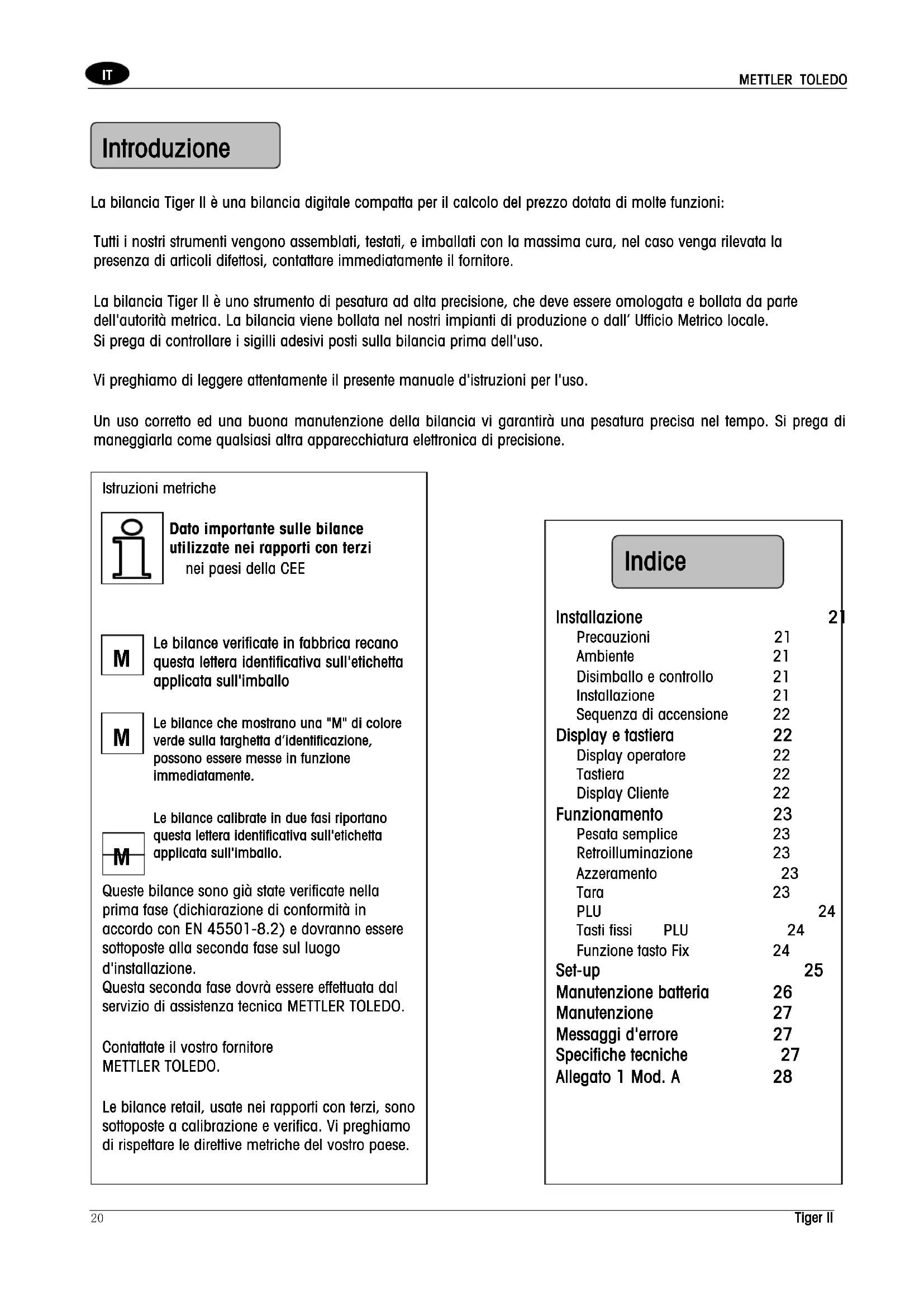 Installazione 21 Precauzioni 21 Ambiente 21 Disimballo e controllo 21 Installazione 21 Sequenza di accensione 22 Display e tastiera 22 Display operatore 22 Tastiera 22 Display Cliente 22 Funzionamento 23 Pesata semplice 23 Retroilluminazione 23 Azzeramento 23 Tara 23 PLU 24 Tasti fissi PLU 24 Funzione tasto Fix 24 Set-up 25 Manutenzione batteria 26 Manutenzione 27 Messaggi d'errore 27 Specifiche tecniche 27 Allegato 1 Mod. A 28 Indice MMETTLER TOLEDO Tiger II 21