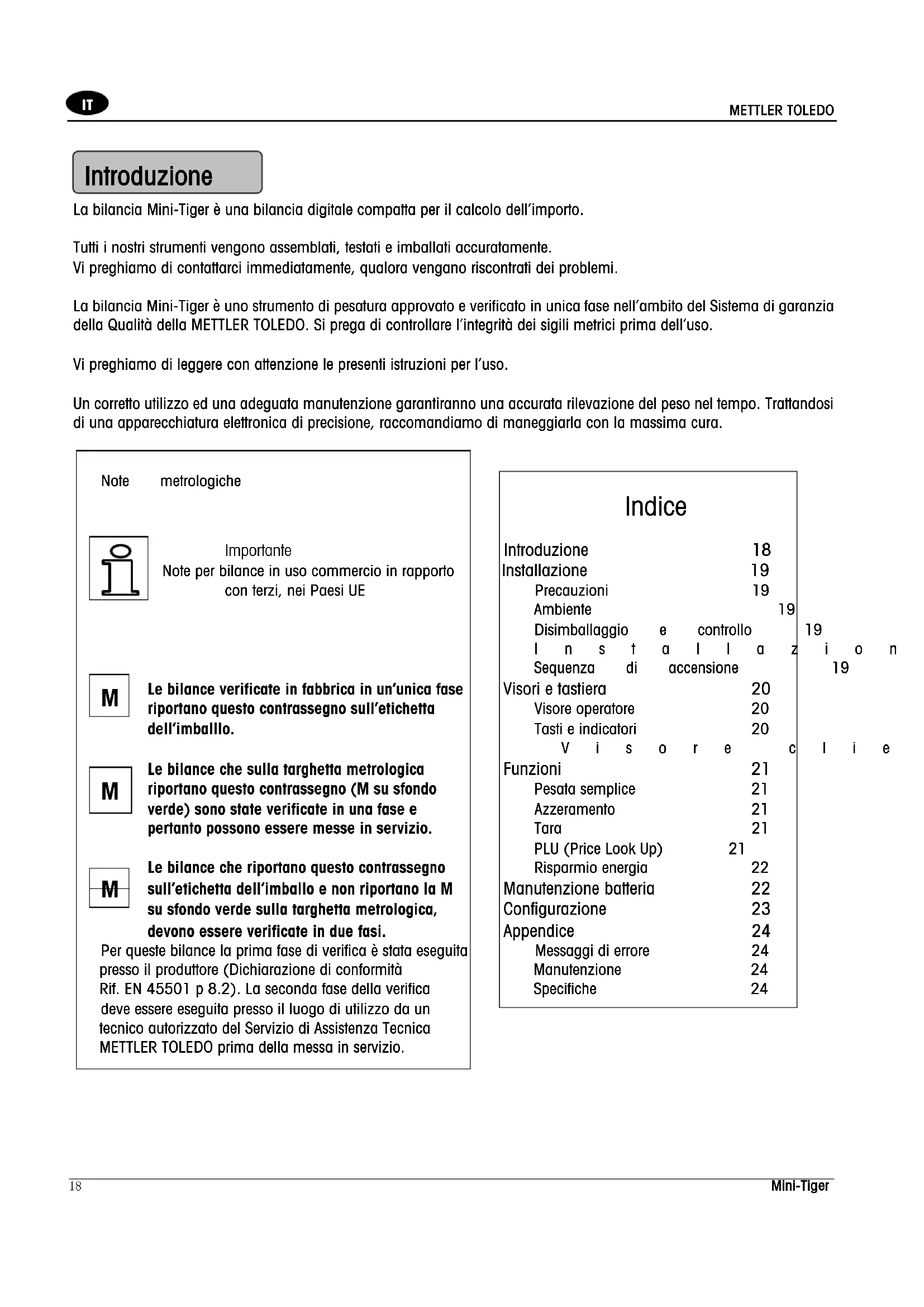 La bilancia Mini-Tiger è una bilancia digitale compatta per il calcolo dell’importo. Tutti i nostri strumenti vengono assemblati, testati e imballati accuratamente. Vi preghiamo di contattarci immediatamente, qualora vengano riscontrati dei problemi. La bilancia Mini-Tiger è uno strumento di pesatura approvato e verificato in unica fase nell’ambito del Sistema di garanzia della Qualità della METTLER TOLEDO. Si prega di controllare l’integrità dei sigili metrici prima dell’uso. Vi preghiamo di leggere con attenzione le presenti istruzioni per l’uso. Un corretto utilizzo ed una adeguata manutenzione garantiranno una accurata rilevazione del peso nel tempo. Trattandosi di una apparecchiatura elettronica di precisione, raccomandiamo di maneggiarla con la massima cura.