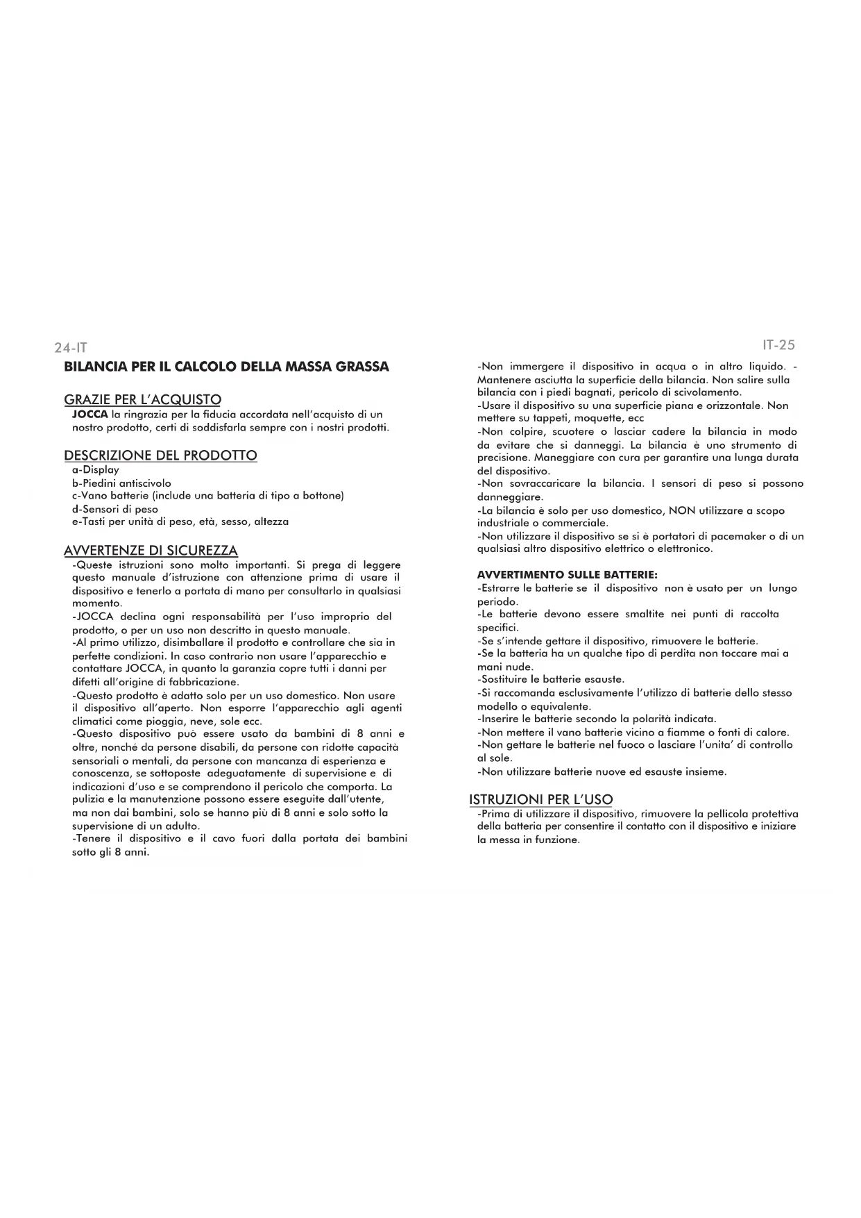 -Queste istruzioni sono molto importanti. Si prega di leggere questo manuale d’istruzione con attenzione prima di usare il dispositivo e tenerlo a portata di mano per consultarlo in qualsiasi momento. -JOCCA declina ogni responsabilità per l’uso improprio del prodotto, o per un uso non descritto in questo manuale. -Al primo utilizzo, disimballare il prodotto e controllare che sia in perfette condizioni. In caso contrario non usare l’apparecchio e contattare JOCCA, in quanto la garanzia copre tutti i danni per difetti all’origine di fabbricazione. -Questo prodotto è adatto solo per un uso domestico. Non usare il dispositivo all’aperto. Non esporre l’apparecchio agli agenti climatici come pioggia, neve, sole ecc. -Questo dispositivo può essere usato da bambini di 8 anni e oltre, nonché da persone disabili, da persone con ridotte capacità sensoriali o mentali, da persone con mancanza di esperienza e conoscenza, se sottoposte adeguatamente di supervisione e di indicazioni d’uso e se comprendono il pericolo che comporta. La pulizia e la manutenzione possono essere eseguite dall’utente, ma non dai bambini, solo se hanno più di 8 anni e solo sotto la supervisione di un adulto. -Tenere il dispositivo e il cavo fuori dalla portata dei bambini sotto gli 8 anni. -Non immergere il dispositivo in acqua o in altro liquido. - Mantenere asciutta la superficie della bilancia. Non salire sulla bilancia con i piedi bagnati, pericolo di scivolamento. -Usare il dispositivo su una superficie piana e orizzontale. Non mettere su tappeti, moquette, ecc -Non colpire, scuotere o lasciar cadere la bilancia in modo da evitare che si danneggi. La bilancia è uno strumento di precisione. Maneggiare con cura per garantire una lunga durata del dispositivo. -Non sovraccaricare la bilancia. I sensori di peso si possono danneggiare. -La bilancia è solo per uso domestico, NON utilizzare a scopo industriale o commerciale. -Non utilizzare il dispositivo se si è portatori di pacemaker o di un qualsiasi altro dispositivo elettrico o elettronico. AVVERTIMENTO SULLE BATTERIE: -Estrarre le batterie se il dispositivo non è usato per un lungo periodo. -Le batterie devono essere smaltite nei punti di raccolta specifici. -Se s’intende gettare il dispositivo, rimuovere le batterie. -Se la batteria ha un qualche tipo di perdita non toccare mai a mani nude. -Sostituire le batterie esauste. -Si raccomanda esclusivamente l’utilizzo di batterie dello stesso modello o equivalente. -Inserire le batterie secondo la polarità indicata. -Non mettere il vano batterie vicino a fiamme o fonti di calore. -Non gettare le batterie nel fuoco o lasciare l’unita’ di controllo al sole. -Non utilizzare batterie nuove ed esauste insieme.