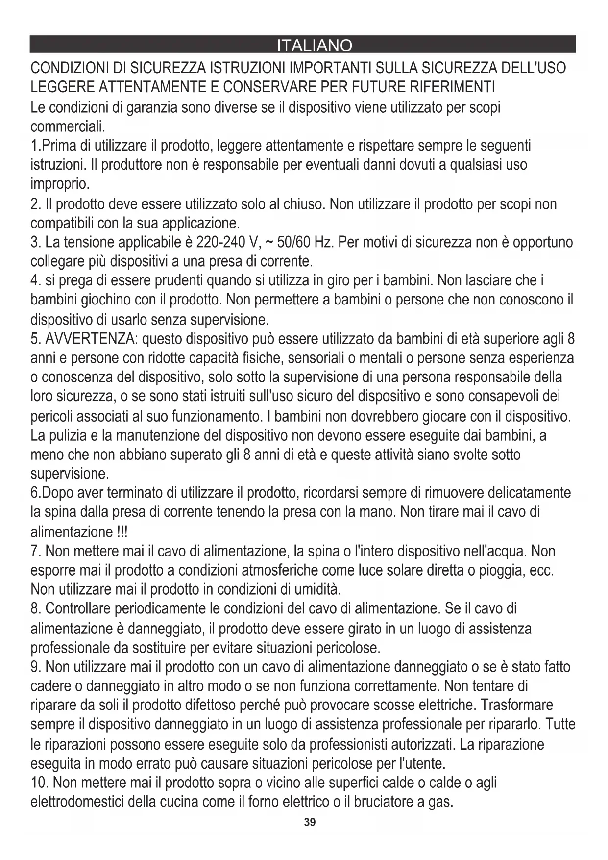 6.Dopo aver terminato di utilizzato il prodotto, ricordarsi sempre di rimuovere delicatamente la spina alla presa di corrente tenendo la presa con la mano. Non tirare mai il cavo di alimentazione !!! - Non mettere mai il cavo di alimentazione, la spina o l'intero dispositivo nell'acqua. Non esporre mai il prodotto a condizioni atmospheriche come luce solare diretta o pioggia, ecc. Non utilizzato mai il prodotto in condizioni di umidità.