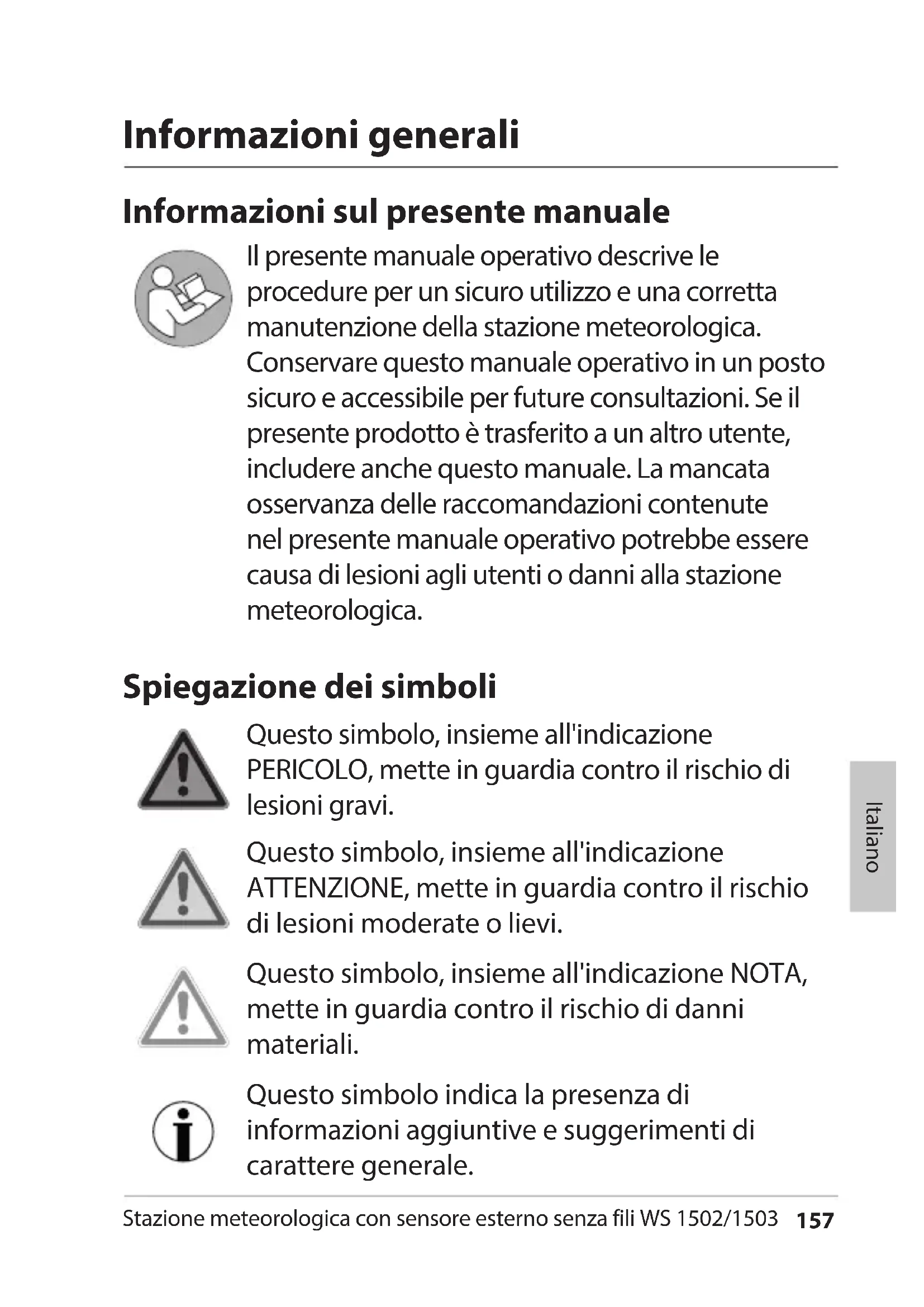Il presente manuale operativo descrive le procedure per un sicuro utilizzo e una corretta manutenzione della stazione meteorologica. Conservare questo manuale operativo in un posto sicuro e accessibile per future consultazioni. Se il presente prodotto è trasferito a un altro utente, includere anche questo manuale. La mancata osservanza delle raccomandazioni contenute nel presente manuale operativo potrebbe essere causa di lesioni agli utenti o danni alla stazione meteorologica.