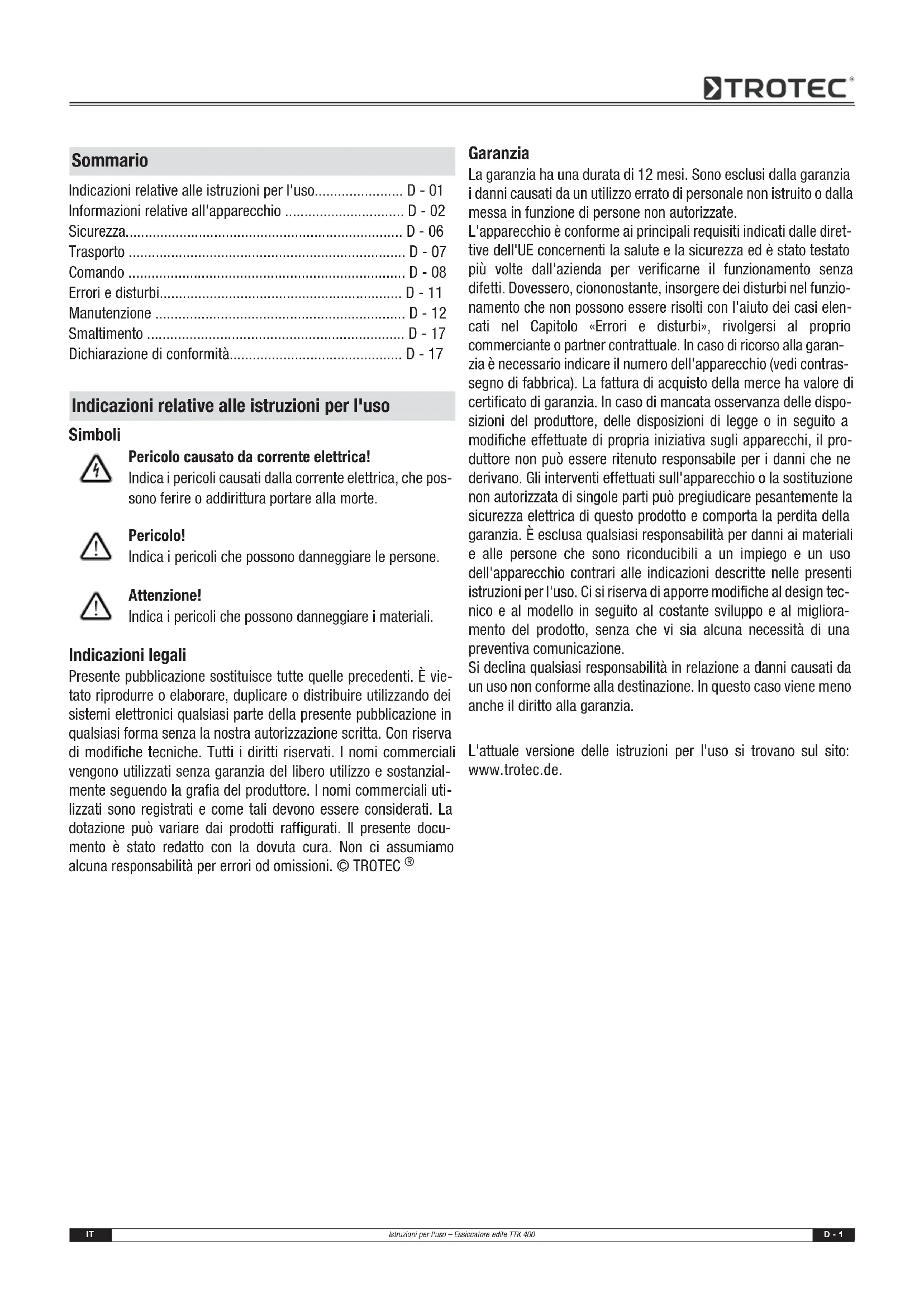 IEC 62233:2005 Le symbole se trouve sur la plaque signalétique de l'appareil. Fabricant : Trotec GmbH & Co. KG Grebbener Straße 7 D-52525 Heinsberg Téléphone : +49 2452 962-400 Fax : +49 2452 962-200 E-Mail : info@trotec.de Heinsberg, le 07/04/2010 PDG : Detlef von der Lieck Élimination des déchets Déclaration de conformitéIT Istruzioni per l'uso – Essiccatore edile TTK 400 D - 1 Simboli Pericolo causato da corrente elettrica! Indica i pericoli causati dalla corrente elettrica, che pos- sono ferire o addirittura portare alla morte. Pericolo! Indica i pericoli che possono danneggiare le persone. Attenzione! Indica i pericoli che possono danneggiare i materiali. Indicazioni legali Presente pubblicazione sostituisce tutte quelle precedenti. È vie- tato riprodurre o elaborare, duplicare o distribuire utilizzando dei sistemi elettronici qualsiasi parte della presente pubblicazione in qualsiasi forma senza la nostra autorizzazione scritta. Con riserva di modifiche tecniche. Tutti i diritti riservati. I nomi commerciali vengono utilizzati senza garanzia del libero utilizzo e sostanzial- mente seguendo la grafia del produttore. I nomi commerciali uti- lizzati sono registrati e come tali devono essere considerati. La dotazione può variare dai prodotti raffigurati. Il presente docu- mento è stato redatto con la dovuta cura. Non ci assumiamo alcuna responsabilità per errori od omissioni. © TROTEC