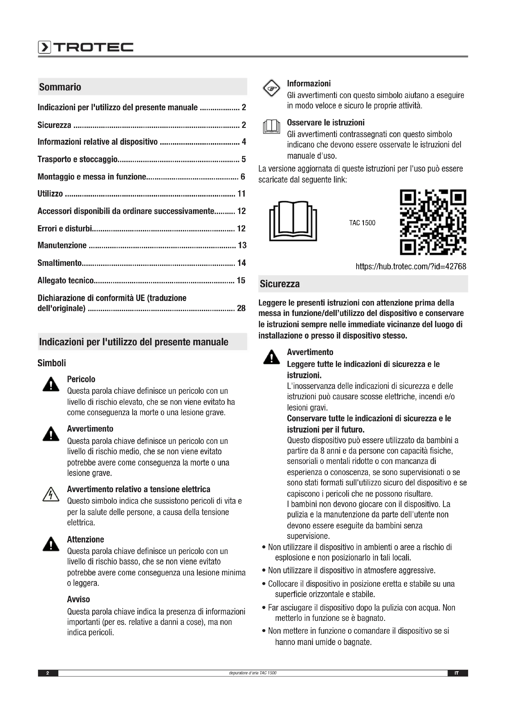 - Dichiarazione di conformità UE (traduzione dell'originale) Indicazioni per l'utilizzo del presente manuale Simboli Pericolo Questa parola chiave definisce un pericolo con un livello di rischio elevato, che se non viene evitato ha come conseguenza la morte o una lesione grave. Avvertimento Questa parola chiave definisce un pericolo con un livello di rischio medio, che se non viene evitato potrebbe avere come conseguenza la morte o una lesione grave. Avvertimento relativo a tensione elettrica Questo simbolo indica che sussistono pericoli di vita e per la salute delle persone, a causa della tensione elettrica. Attenzione Questa parola chiave definisce un pericolo con un livello di rischio basso, che se non viene evitato potrebbe avere come conseguenza una lesione minima o leggera. Avviso Questa parola chiave indica la presenza di informazioni importanti (per es. relative a danni a cose), ma non indica pericoli. Informazioni Gli avvertimenti con questo simbolo aiutano a eseguire in modo veloce e sicuro le proprie attività. Osservare le istruzioni Gli avvertimenti contrassegnati con questo simbolo indicano che devono essere osservate le istruzioni del manuale d'uso. La versione aggiornata di queste istruzioni per l'uso può essere scaricate dal seguente link: TAC 1500 https://hub.trotec.com/?id=42768 Sicurezza Leggere le presenti istruzioni con attenzione prima della messa in funzione/dell’utilizzo del dispositivo e conservare le istruzioni sempre nelle immediate vicinanze del luogo di installazione o presso il dispositivo stesso. Avvertimento Leggere tutte le indicazioni di sicurezza e le istruzioni. L'inosservanza delle indicazioni di sicurezza e delle istruzioni può causare scosse elettriche, incendi e/o lesioni gravi. Conservare tutte le indicazioni di sicurezza e le istruzioni per il futuro. Questo dispositivo può essere utilizzato da bambini a partire da 8 anni e da persone con capacità fisiche, sensoriali o mentali ridotte o con mancanza di esperienza o conoscenza, se sono supervisionati o se sono stati formati sull'utilizzo sicuro del dispositivo e se capiscono i pericoli che ne possono risultare. I bambini non devono giocare con il dispositivo. La pulizia e la manutenzione da parte dell'utente non devono essere eseguite da bambini senza supervisione. p. 28