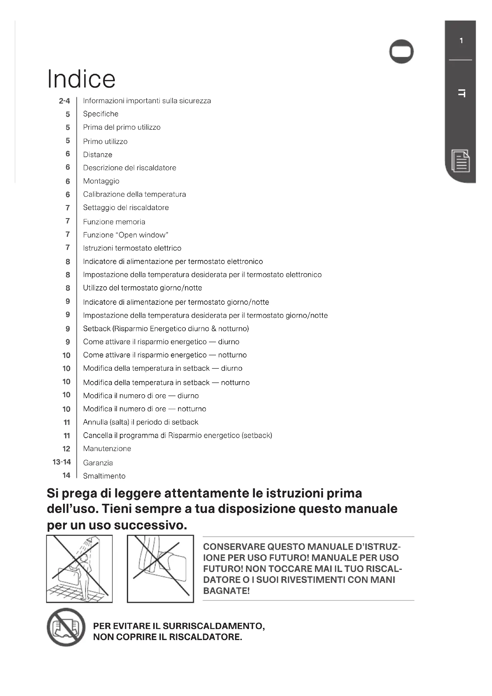 Informazioni importanti sulla sicurezza Specifiche Prima del primo utilizzo Primo utilizzo Distanze Descrizione del riscaldatore Montaggio Calibrazione della temperatura Settaggio del riscaldatore Funzione memoria Funzione “Open window” Istruzioni termostato elettrico Indicatore di alimentazione per termostato elettronico Impostazione della temperatura desiderata per il termostato elettronico Utilizzo del termostato giorno/notte Indicatore di alimentazione per termostato giorno/notte Impostazione della temperatura desiderata per il termostato giorno/notte Setback (Risparmio Energetico diurno & notturno) Come attivare il risparmio energetico — diurno Come attivare il risparmio energetico — notturno Modifica della temperatura in setback — diurno Modifica della temperatura in setback — notturno Modifica il numero di ore — diurno Modifica il numero di ore — notturno Annulla (salta) il periodo di setback Cancella il programma di Risparmio energetico (setback) Manutenzione Garanzia Smaltimento Si prega di leggere attentamente le istruzioni prima dell’uso. Tieni sempre a tua disposizione questo manuale per un uso successivo.