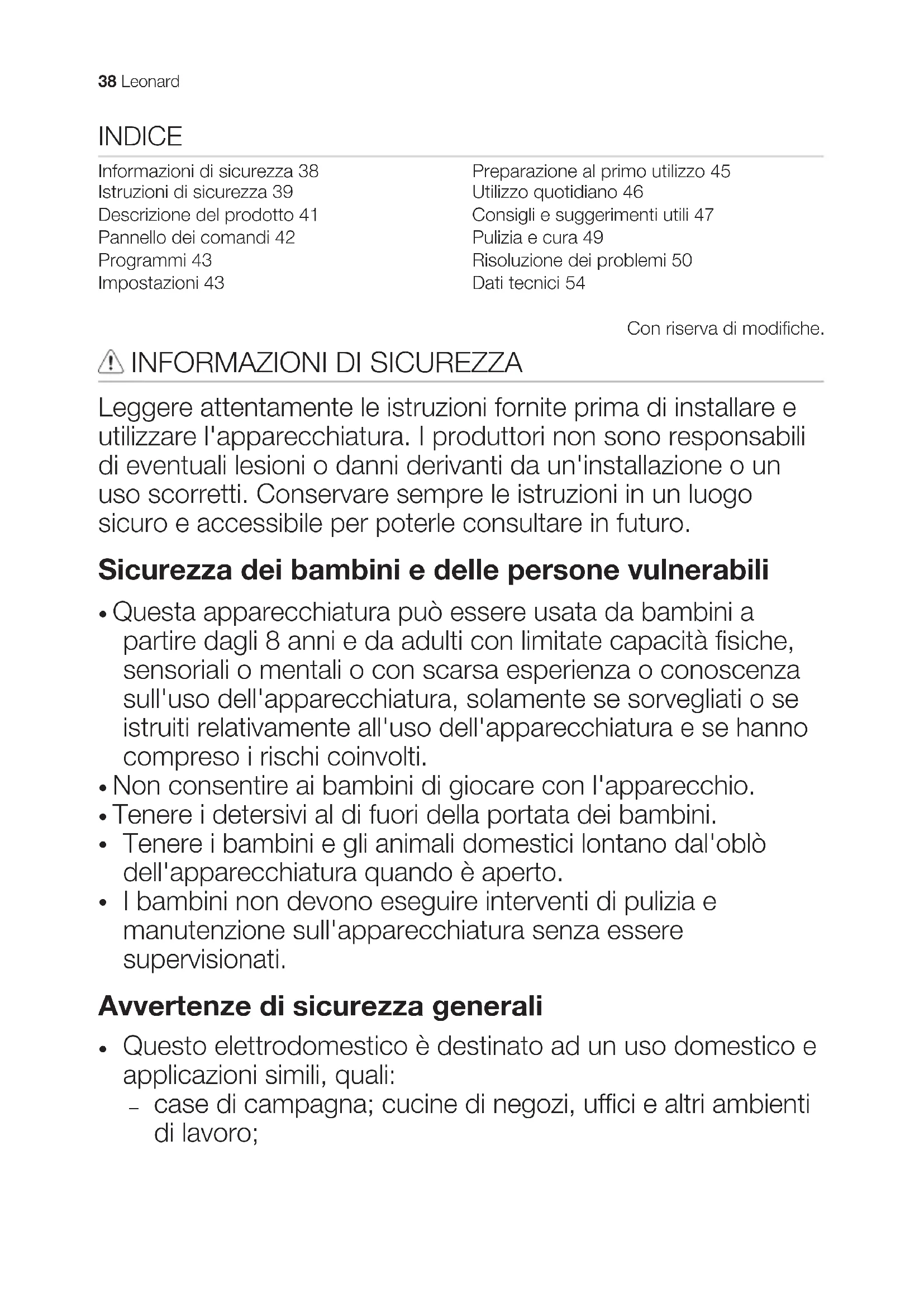 - Utilizzare sempre una presa elettrica con contatto di protezione correttamente installata. Leonard 39• Non utilizzare prese multiple e prolunghe.