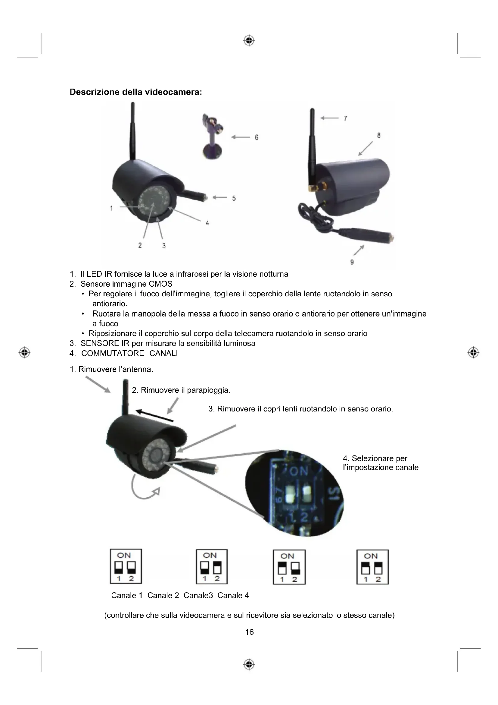 Canale 1 Canale 2 Canale3 Canale 4 (controllare che sulla videocamera e sul ricevitore sia selezionato lo stesso canale)