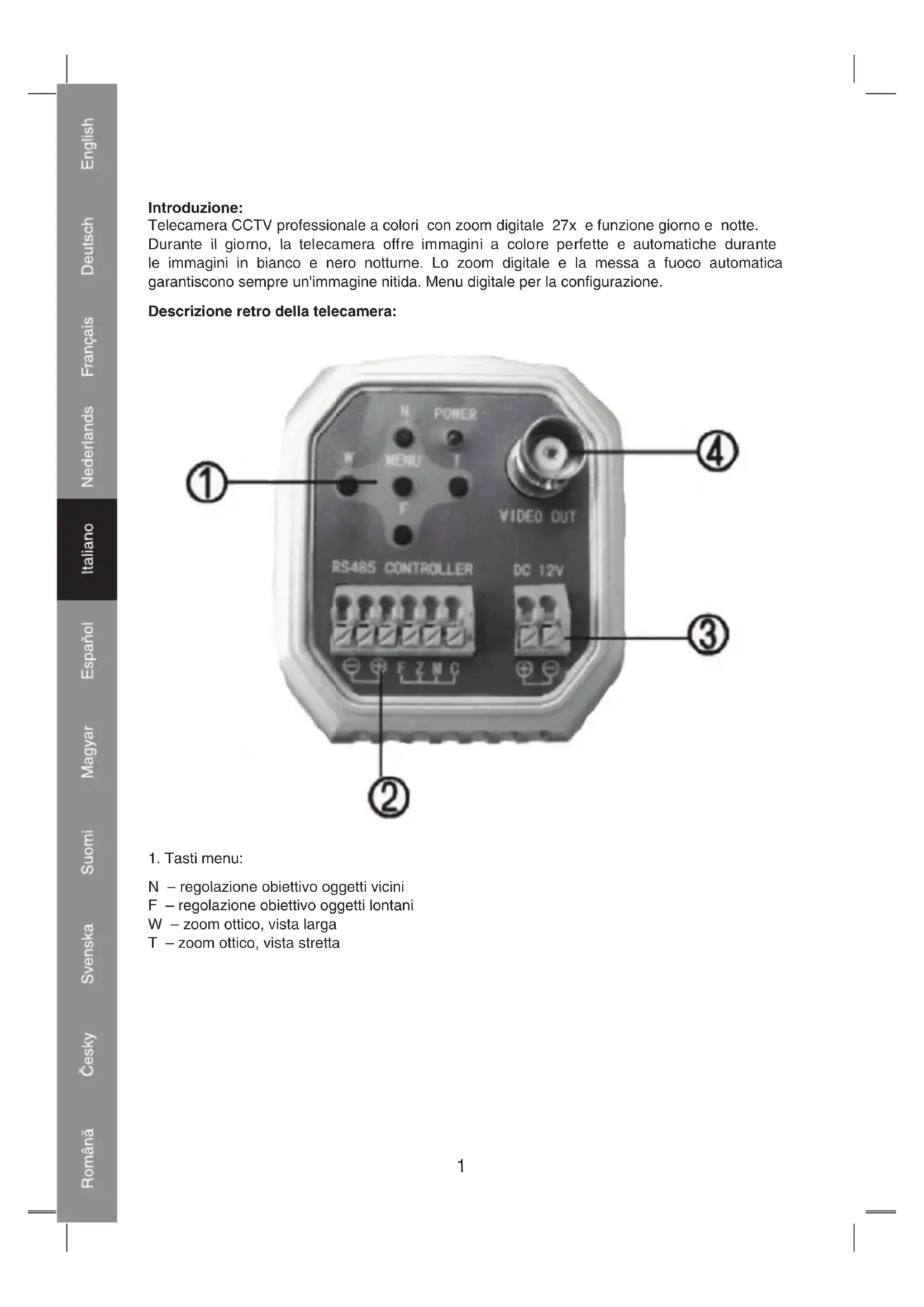 TELECAMERA CCTV 27x ZOOM1 Introduzione: Telecamera CCTV professionale a colori con zoom digitale 27x e funzione giorno e notte. Durante il giorno, la telecamera offre immagini a colore perfette e automatiche durante le immagini in bianco e nero notturne. Lo zoom digitale e la messa a fuoco automatica garantiscono sempre un'immagine nitida. Menu digitale per la congurazione. Descrizione retro della telecamera: