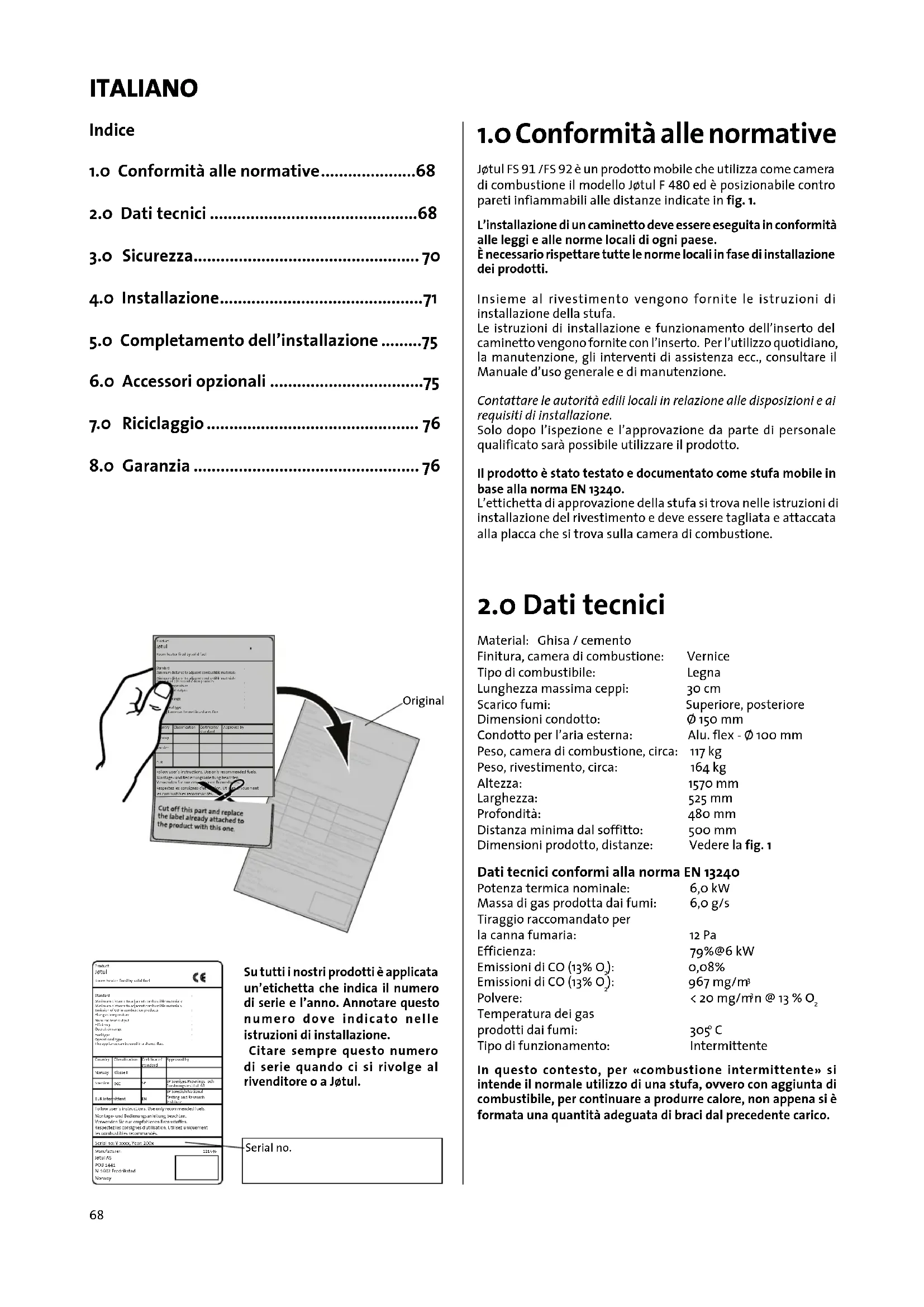 Jøtul FS 91 /FS 92 è un prodotto mobile che utilizza come camera di combustione il modello Jøtul F 480 ed è posizionabile contro pareti infiammabili alle distanze indicate in fig. 1. L’installazione di un caminetto deve essere eseguita in conformità alle leggi e alle norme locali di ogni paese. È necessario rispettare tutte le norme locali in fase di installazione dei prodotti. Insieme al rivestimento vengono fornite le istruzioni di installazione della stufa. Le istruzioni di installazione e funzionamento dell’inserto del caminetto vengono fornite con l’inserto. Per l’utilizzo quotidiano, la manutenzione, gli interventi di assistenza ecc., consultare il Manuale d’uso generale e di manutenzione. Contattare le autorità edili locali in relazione alle disposizioni e ai requisiti di installazione. Solo dopo l’ispezione e l’approvazione da parte di personale qualificato sarà possibile utilizzare il prodotto. Il prodotto è stato testato e documentato come stufa mobile in base alla norma EN 13240. L’ettichetta di approvazione della stufa si trova nelle istruzioni di installazione del rivestimento e deve essere tagliata e attaccata alla placca che si trova sulla camera di combustione.
