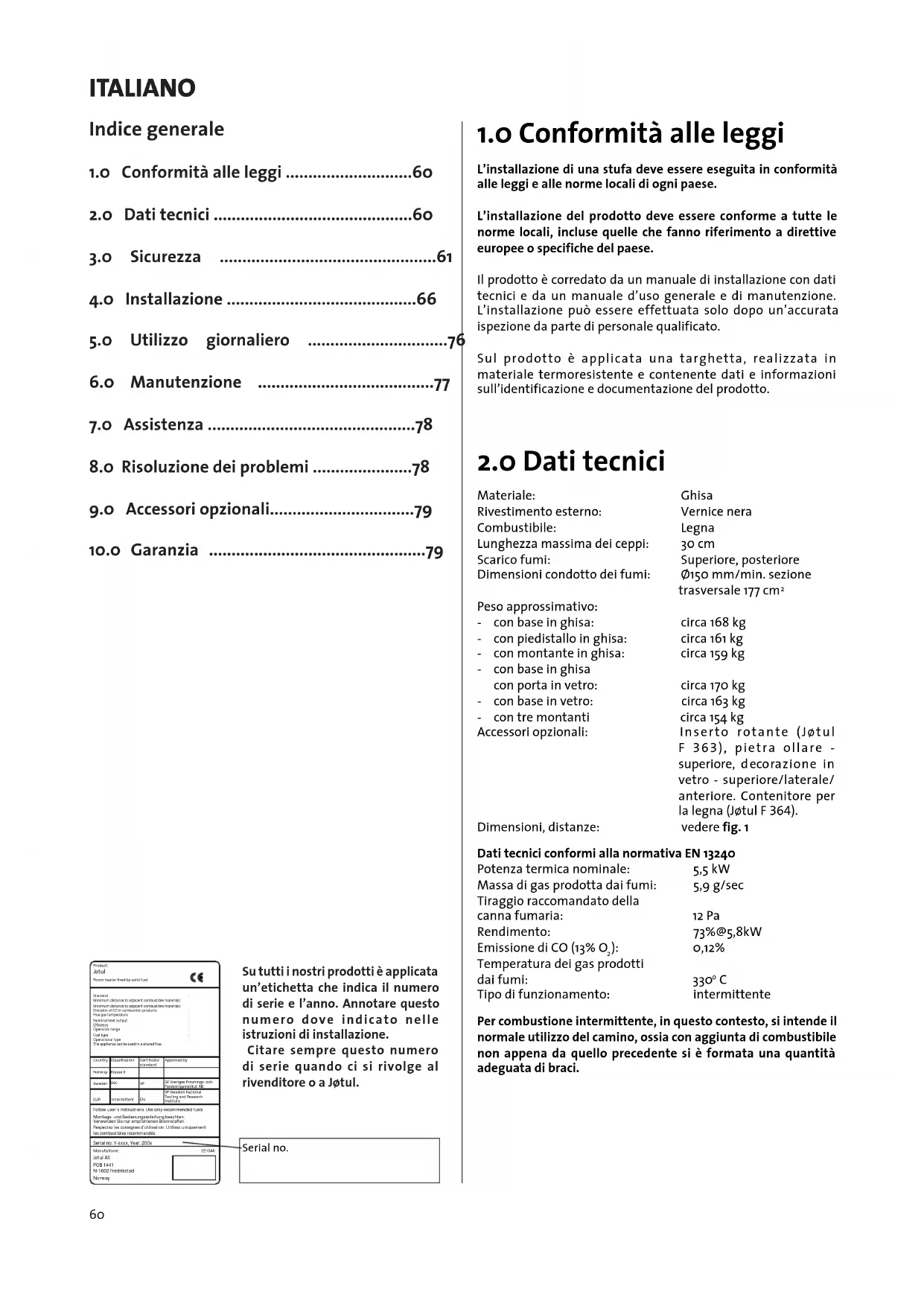 L’installazione di una stufa deve essere eseguita in conformità alle leggi e alle norme locali di ogni paese. L’installazione del prodotto deve essere conforme a tutte le norme locali, incluse quelle che fanno riferimento a direttive europee o specifiche del paese. Il prodotto è corredato da un manuale di installazione con dati tecnici e da un manuale d’uso generale e di manutenzione. L’installazione può essere effettuata solo dopo un’accurata ispezione da parte di personale qualificato. Sul prodotto è applicata una targhetta, realizzata in materiale termoresistente e contenente dati e informazioni sull’identificazione e documentazione del prodotto.