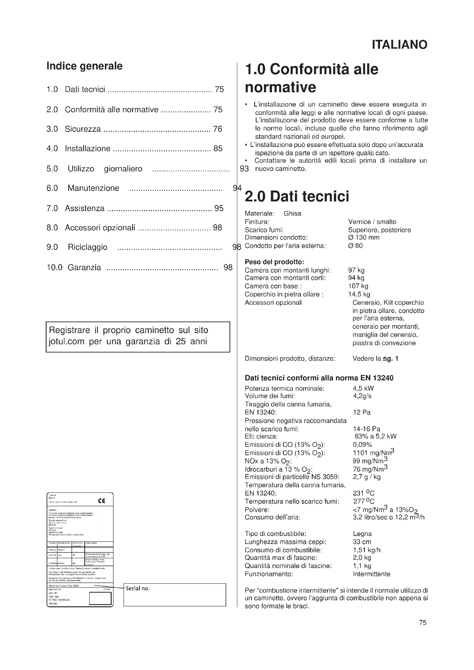 Jotul si riserva il diritto di rifiutare qualsiasi sostituzione di componenti o attività di assistenza nel caso in cui la garanzia non sia stata registrata online. La presente garanzia non pregiudica alcun diritto previsto delle normative nazionali che disciplinano la vendita di prodotti al consumo. Il diritto di reclamo del città è valido alla data di acquisto e solo dietro presentazione di scontrinoNumero di seriie.
