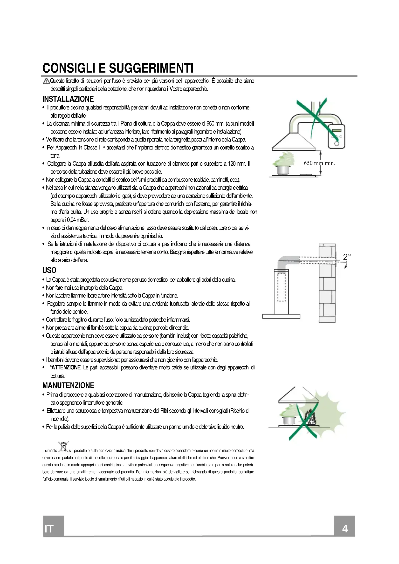 - Prima di procedere a qualsiasi operazione di manutenzione, disinserire la Cappa togliendo la spina elettri-ca o spegnendo l’interruttore generale. • Effettuare una scrupolosa e tempestiva manutenzione dei Filtri secondo gli intervalli consigliati (Rischio di incendio). • Per la pulizia delle superfici della Cappa è sufficiente utilizzare un panno umido e detersivo liquido neutro. Il simbolo sul prodotto o sulla confezione indica che il prodotto non deve essere considerato come un normale rifiuto domestico, ma deve essere portato nel punto di raccolta appropriato per il riciclaggio di apparecchiature elettriche ed elettroniche. Provvedendo a smaltire questo prodotto in modo appropriato, si contribuisce a evitare potenziali conseguenze negative per l’ambiente e per la salute, che potreb- bero derivare da uno smaltimento inadeguato del prodotto. Per informazioni più dettagliate sul riciclaggio di questo prodotto, contattare l’ufficio comunale, il servizio locale di smaltimento rifiuti o il negozio in cui è stato acquistato il prodotto.