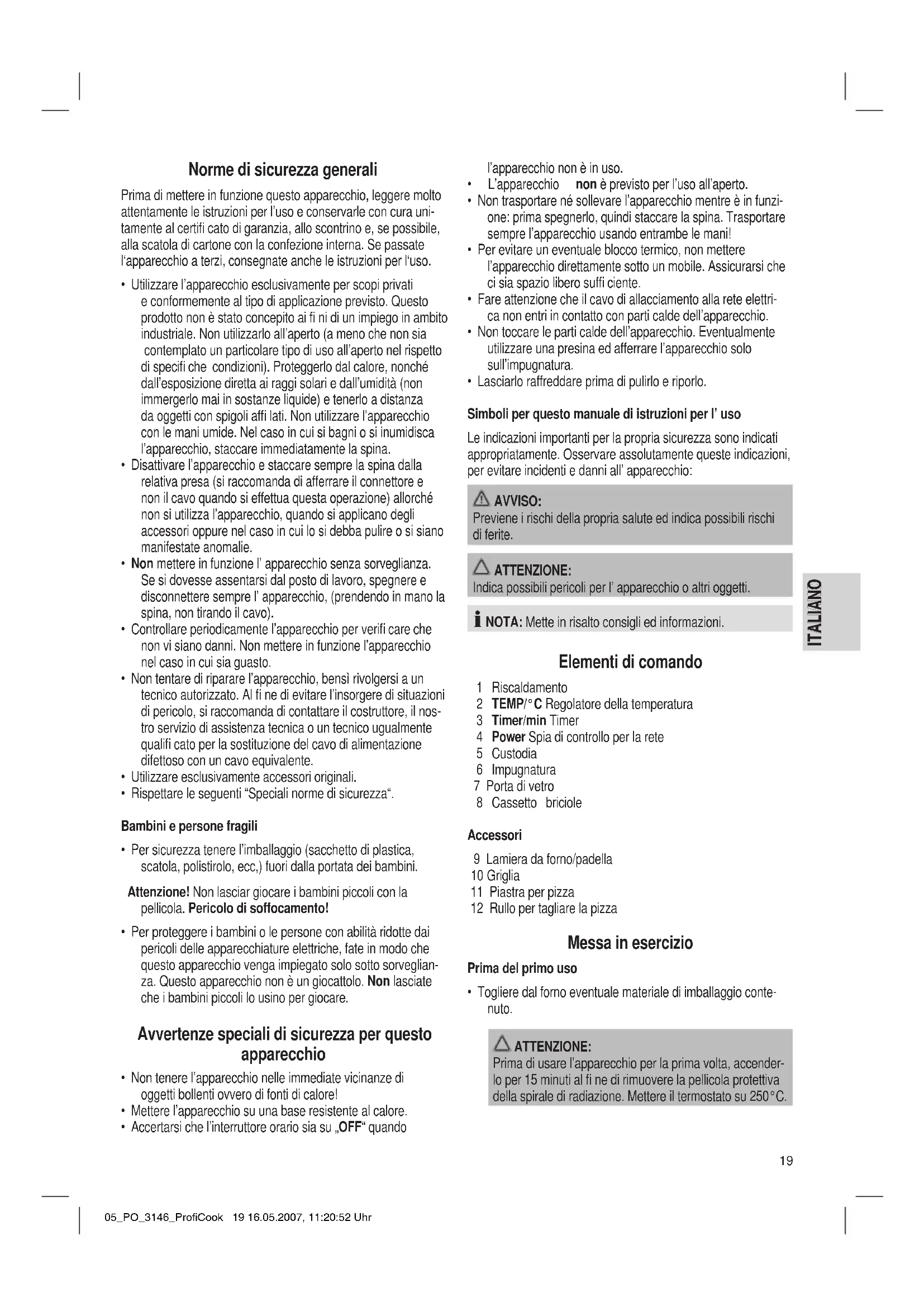 - Togliere dal forno eventuale materiale di imballaggio conte- nuto. ATTENZIONE: Prima di usare l’apparecchio per la prima volta, accender- lo per 15 minuti al fi ne di rimuovere la pellicola protettiva della spirale di radiazione. Mettere il termostato su 250°C. 05_PO_3146_ProfiCook 19 16.05.2007, 11:20:52 Uhr20 ITALIANO ITALIANO NOTA: E’ normale che fuoriesca un po’ di fumo. Provvedete ad una buona circolazione dell’aria. Uso