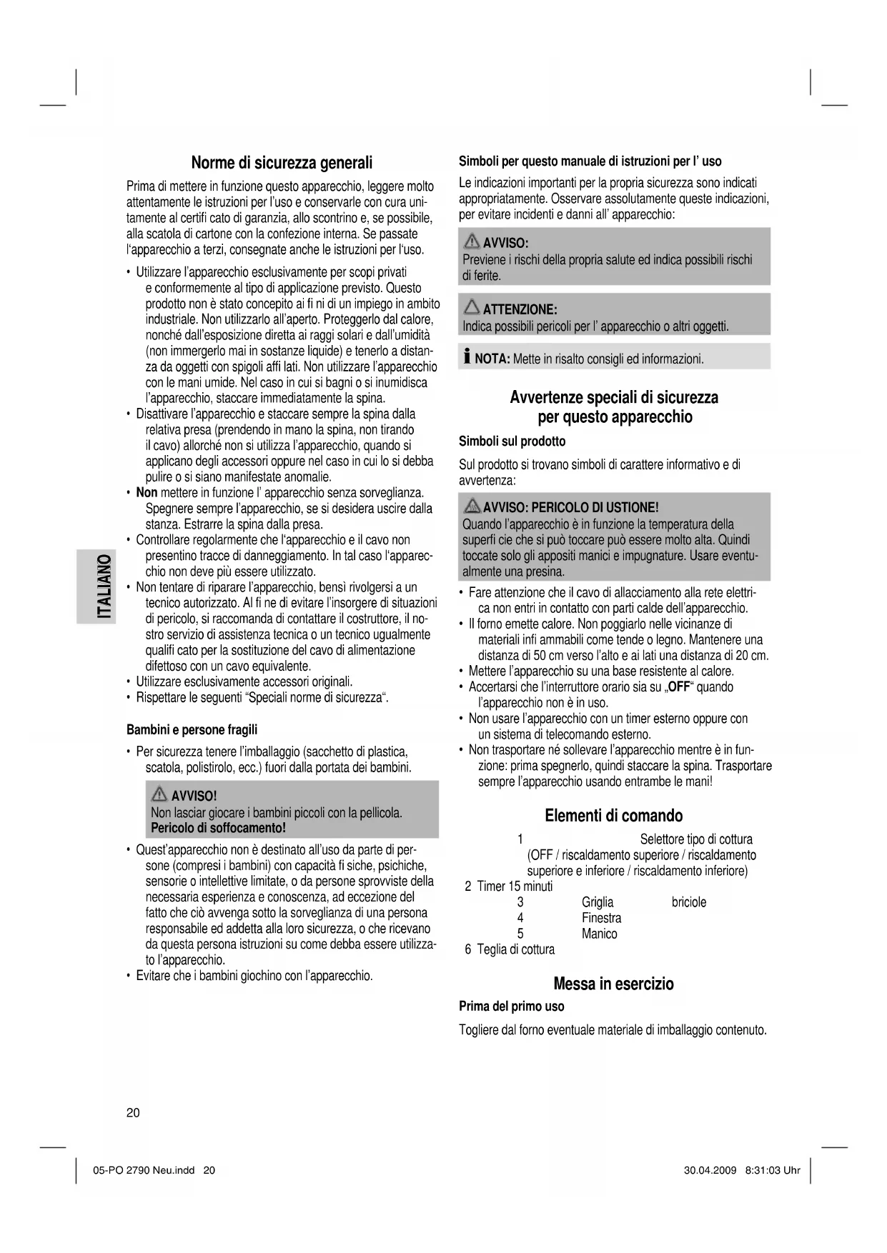 - Non trasportare né sollevare l’apparecchio mentre è in fun- zione: prima spegnerlo, quindi staccare la spina. Trasportare sempre l’apparecchio usando entrambe le mani! Elementi di comando 1 Selettore tipo di cottura (OFF / riscaldamento superiore / riscaldamento superiore e inferiore / riscaldamento inferiore) 2 Timer 15 minuti 3 Griglia briciole 4 Finestra 5 Manico 6 Teglia di cottura Messa in esercizio Prima del primo uso Togliere dal forno eventuale materiale di imballaggio contenuto. 05-PO 2790 Neu.indd 2005-PO 2790 Neu.indd 20 30.04.2009 8:31:03 Uhr30.04.2009 8:31:03 Uhr21 ITALIANO ITALIANO ATTENZIONE: Prima di usare l’apparecchio per la prima volta, accenderlo per 15 minuti al fi ne di rimuovere la pellicola protettiva della spirale di radiazione. Mettere il termostato su 250°C. NOTA: Facendo questo è possibile che si formi un leggero fumo e odore. Arieggiare suffi cientemente. Uso