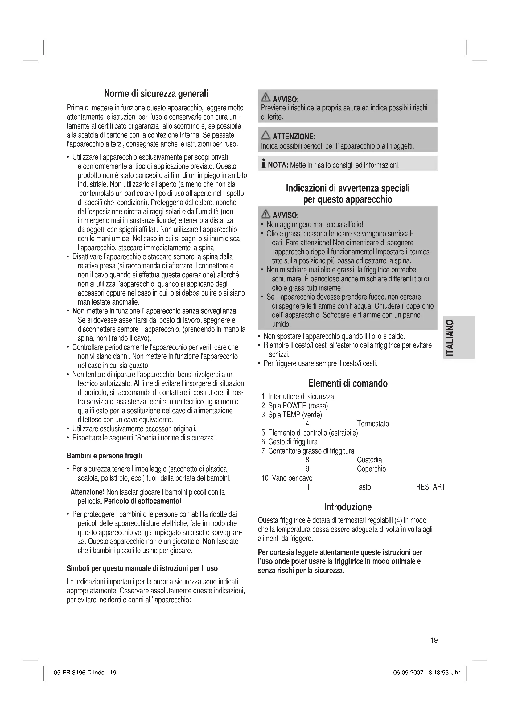 - Per friggere usare sempre il cesto/i cesti. Elementi di comando 1 Interruttore di sicurezza 2 Spia POWER (rossa) 3 Spia TEMP (verde) 4 Termostato 5 Elemento di controllo (estraibile) 6 Cesto di friggitura 7 Contenitore grasso di friggitura 8 Custodia 9 Coperchio 10 Vano per cavo 11 Tasto RESTART Introduzione Questa friggitrice è dotata di termostati regolabili (4) in modo che la temperatura possa essere adeguata di volta in volta agli alimenti da friggere. Per cortesia leggete attentamente queste istruzioni per l’uso onde poter usare la friggitrice in modo ottimale e senza rischi per la sicurezza. 05-FR 3196 D.indd 1905-FR 3196 D.indd 19 06.09.2007 8:18:53 Uhr06.09.2007 8:18:53 Uhr20 ITALIANO ITALIANO Collegamento elettrico Potenza allacciata La friggitrice doppia può assorbire una potenza massima totale di 4000 W. Con questa potenza allacciata si consigliano due linee di alimentazione separate con una sicura mediante un interruttore di protezione a fi ni domestici da 16 A. L’apparecchio può essere collegato solo ad una presa con contatto di terra regolarmente installata da 230 V, 50 Hz. Ogni lato della friggitrice può essere azionato anche separata- mente perché l‘apparecchio dispone di due linee di alimenta- zione. ATTENZIONE: SOVRACCARICO A causa della potenza di questo apparecchio, non fare uso di cavi di prolungamento oppure di prese multiple. Messa in esercizio Prima della prima messa in esercizio