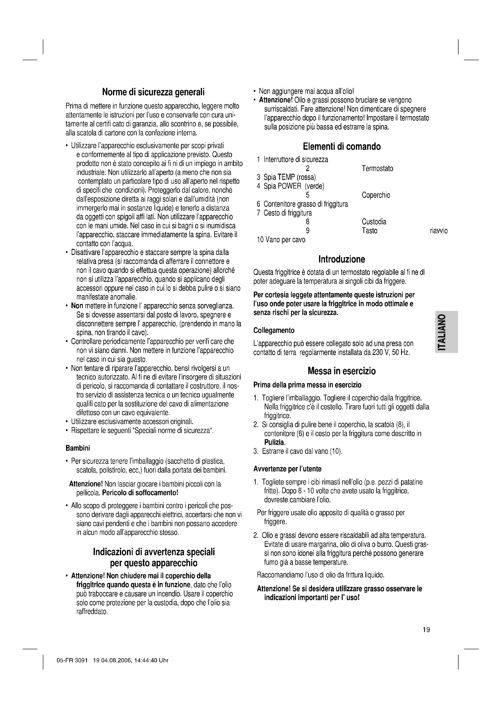 Evitate di usare margarina, olio di oliva o burro. Questi gras- si non sono idonei alla friggitura perché possono generare fumo già a basse temperature. Raccomandiamo l’uso di olio da frittura liquido. Attenzione! Se si desidera utilizzare grasso osservare le indicazioni importanti per l’ uso! 05-FR 3091 19 04.08.2006, 14:44:40 Uhr20 ITALIANO ITALIANO Se si usa grasso, tagliarlo a pezzettini. Impostare il termo- stato su una temperature bassa ed aggiungere lentamente I pezzettini. Quando il grasso si è sciolto ed ha raggiunto il livello d’ olio, impostare il termostato sulla temperatura desiderata. Non mettere il grasso in nessun caso nel cesto da frittura!
