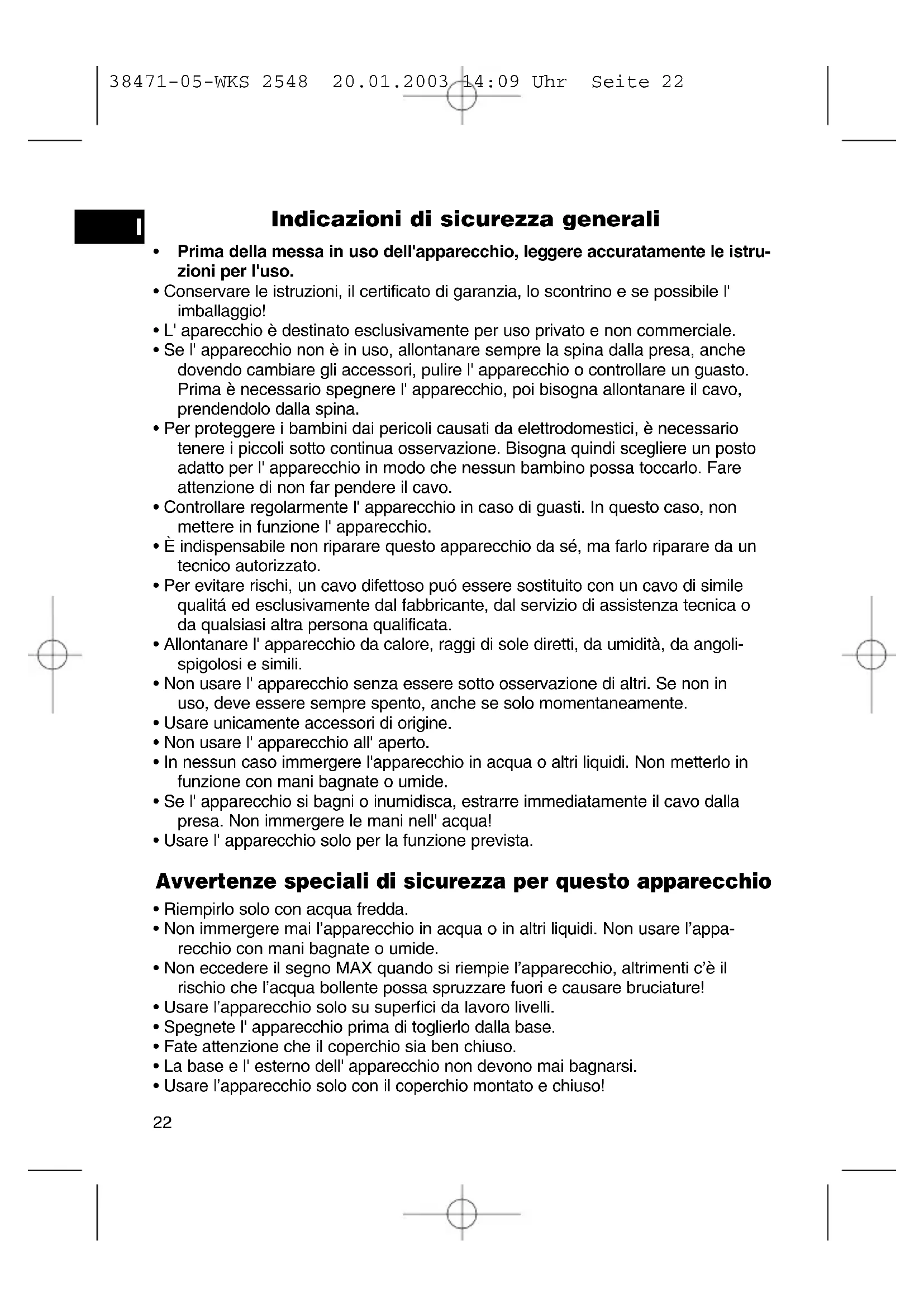 38471-05-WKS 2548 20.01.2003 14:09 Uhr Seite 22Elenco degli elementi 1 Tasto per lo sgancio del coperchio 2 Contenitore dell’acqua 3 Base 4 Meccanismo d’apertura 5 Tasto di sgancio del meccanismo d’apertura 6 Tasto On/Off Messa in funzione dell' apparecchio Prima di usare l' apparecchio fate bollire due volte dell' acqua fresca- senza aggiun- ta di altre sostanze. Non adoperare quest’acqua.