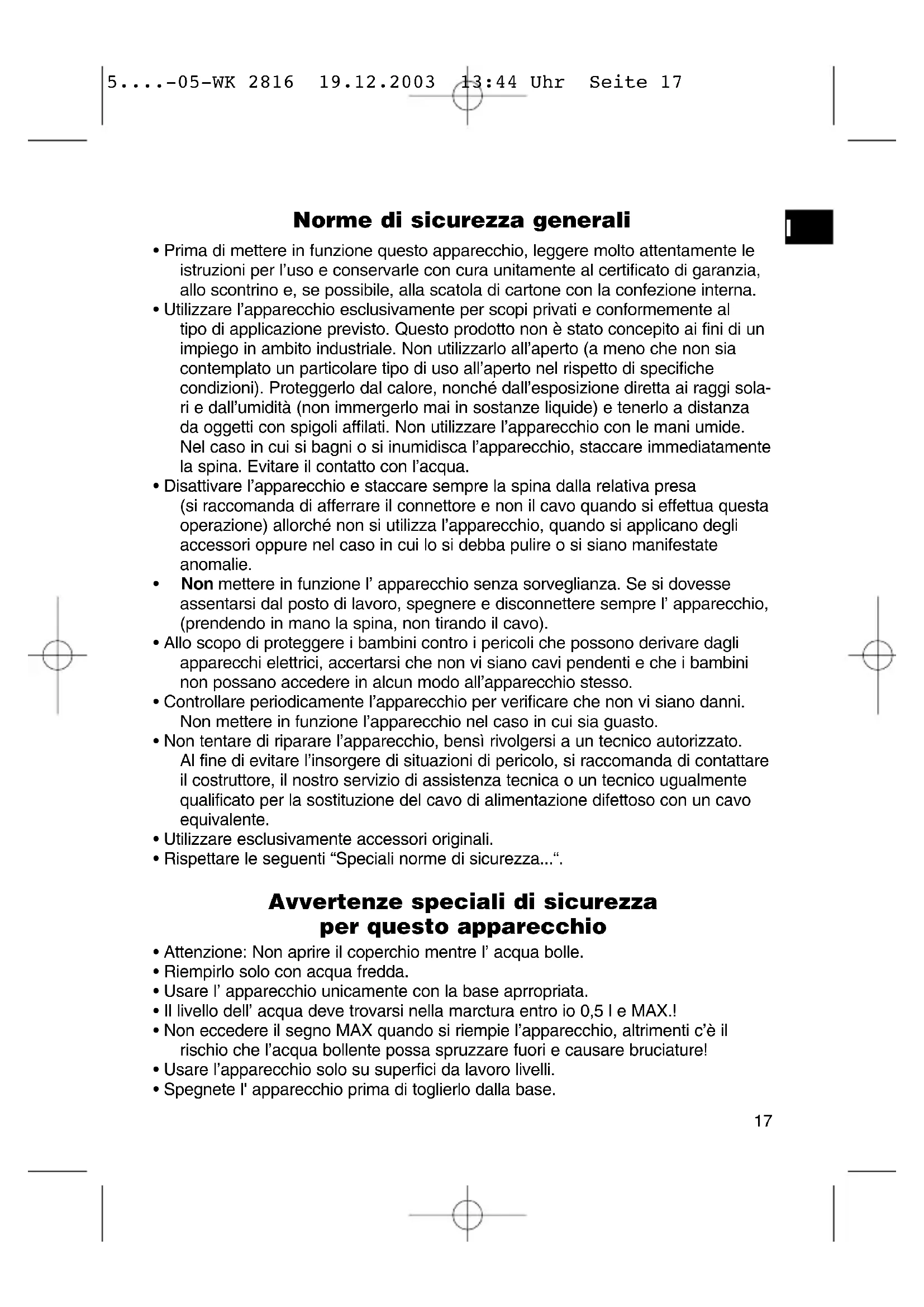 5....-05-WK 2816 19.12.2003 13:44 Uhr Seite 18Garanzia Per l’apparecchio da noi messo in commercio ci assumiamo una garanzia di 24 mesi dalla data di acquisto (scontrino). Durante la garanzia noi ci impegniamo ad eliminare gratuitamente i guasti dell’ap- parecchio o degli accessori*), dovuti a difetti di materiale o di fabbricazione, ripa- randoli o, a nostra discrezione, sostituendoli. Le prestazioni in garanzia danno luogo a una proroga della garanzia né danno diritto ad una nuova garanzia! Per la garanzia è sufficiente lo scontrino di acquisto. Senza questo scontrino non sussiste il diritto né ad una sostituzione né ad una riparazione gratuita. Nel caso si ricorra alla garanzia, restituire al rivenditore l’apparecchio completo in ogni sua parte, nell’imballaggio originale unitamente allo scontrino. *) Danni agli accessori non giustificano automaticamente lo scambio gratuito dell’- apparecchio completo. Si prega di mettersi in contatto con la nostra centrale telefo- nica. Danni alle parti di vetro oppure fratture ai pezzi di materia plastica sono obbli- gatoriamente a spese del cliente. La riparazione di pezzi d’uso ovvero soggetti a logoramento (cursori, ganci impa- statori, cinghie di trasmissione, telecomandi di ricambio, spazzolini di ricambio, lame di seghe ecc.) come anche operazioni di pulizia e manutenzione o la sostitu- zione di pezzi soggetti a logoramento non rientrano nella garanzia e quindi sono a pagamento! La garanzia si annulla nel caso di intervento da parte di terzi. Dopo la garanzia Al termine della garanzia le riparazioni possono essere eseguite dietro pagamento dal corrispettivo negozio specializzato o servizio riparazioni.