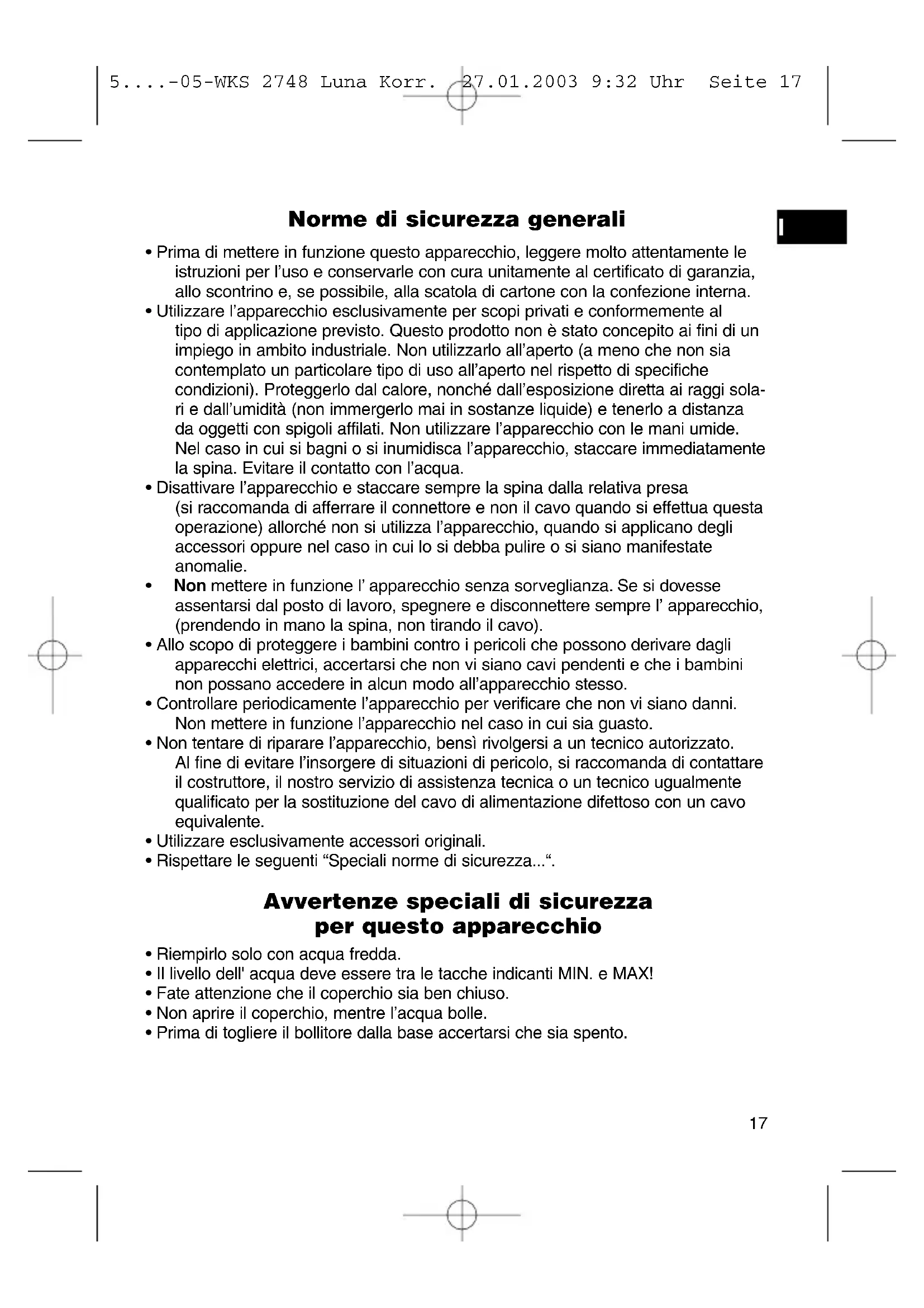 5....-05-WKS 2748 Luna Korr. 27.01.2003 9:32 Uhr Seite 17Messa in funzione dell' apparecchio Per cortesia leggere attentamente queste istruzioni per l’uso e conservarle in un luogo sicuro. Prima di usare l’apparecchio per la prima volta far bollire due volte acqua fresca. Usare solo acqua fresca senza l’aggiunta di altre sostanze. Uso