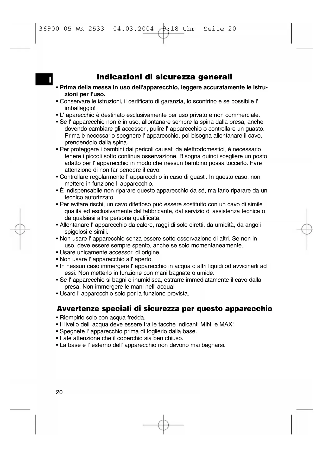 36900-05-WK 2533 04.03.2004 9:18 Uhr Seite 20Messa in funzione dell' apparecchio Prima di usare l' apparecchio fate bollire due volte dell' acqua fresca- senza aggiun- ta di altre sostanze.