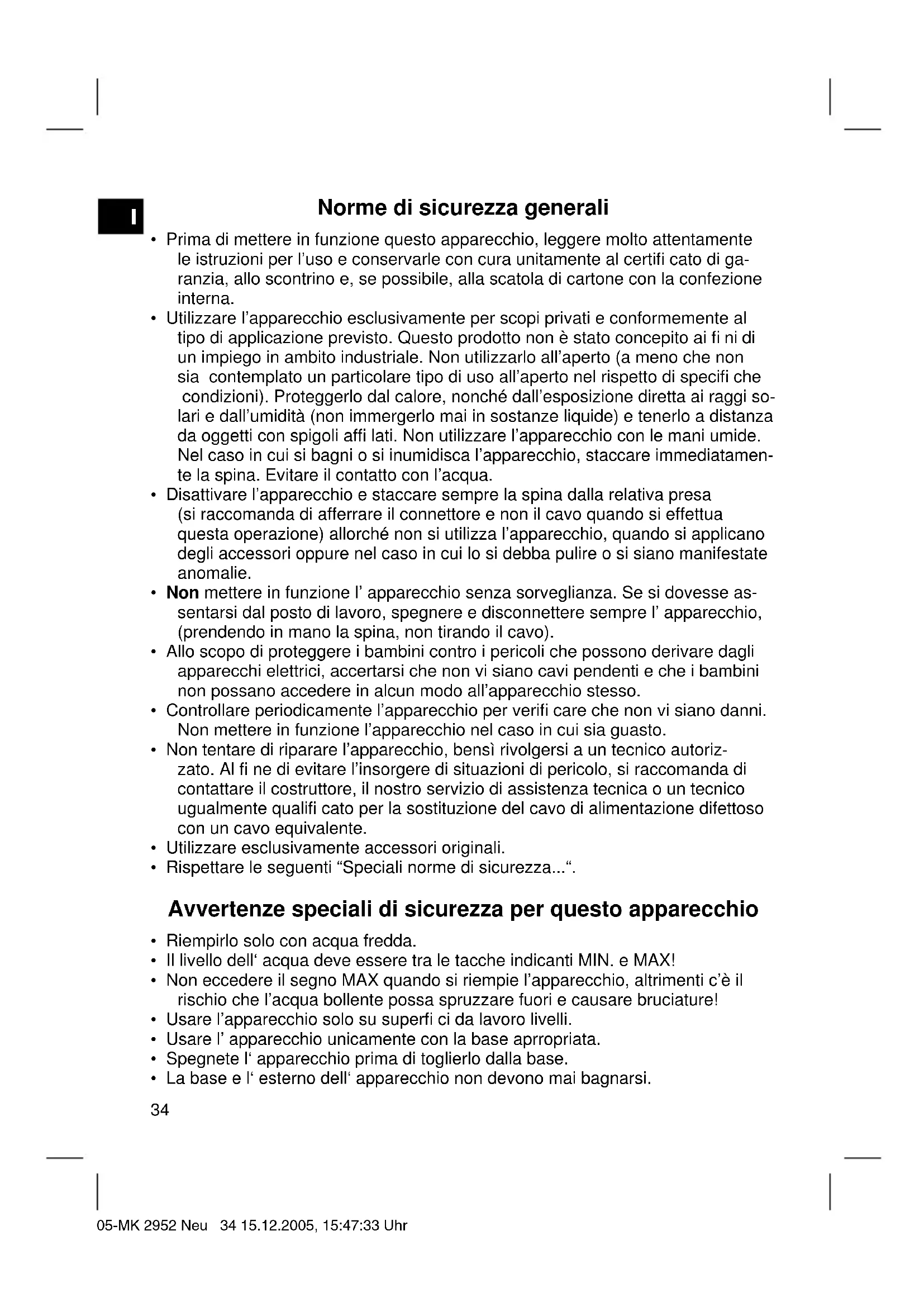 - Collegate l‘ apparecchio solo ad una presa con contatto di terra regolarmente installata di 230 V, 50 Hz. 05-MK 2952 Neu 35 15.12.2005, 15:47:34 UhrI