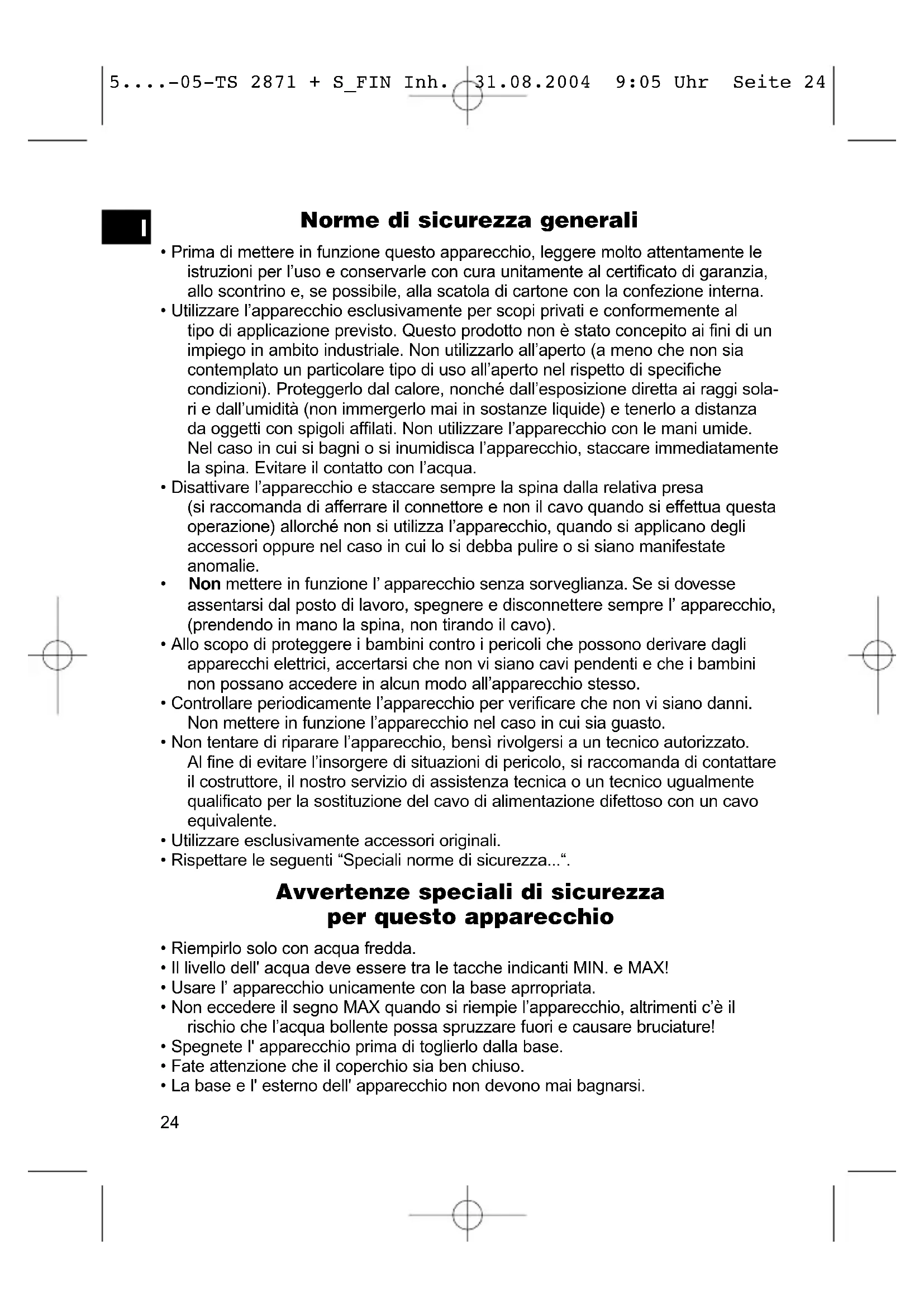 5....-05-TS 2871 + S_FIN Inh. 31.08.2004 9:05 Uhr Seite 24Elenco degli elementi Base 1 Interruttore on/off per la piastra termica 2 Piastra termica 3 Indicatore luminoso di controllo per la piastra termica 4 Collegamento bollitore 5 Collegamento alla rete elettrica Teiera 6 Coperchio 7 Manico 8 Filtro tè Bollitore 9 Coperchio 10 Interruttore on/off 11 Indicatore di livello 12 Beccuccio con filtro anticalcare 13 Collegamento elettrico alla base Messa in funzione dell' apparecchio Per cortesia leggere attentamente queste istruzioni per l’uso e conservarle in un luogo sicuro. Avanti il primo utilizzo lavare la teiera una volta e portare 2x ad ebolli- zione acqua fresca nel bollitore. Usare solo acqua fresca senza l’aggiunta di altre sostanze. Collegamento elettrico