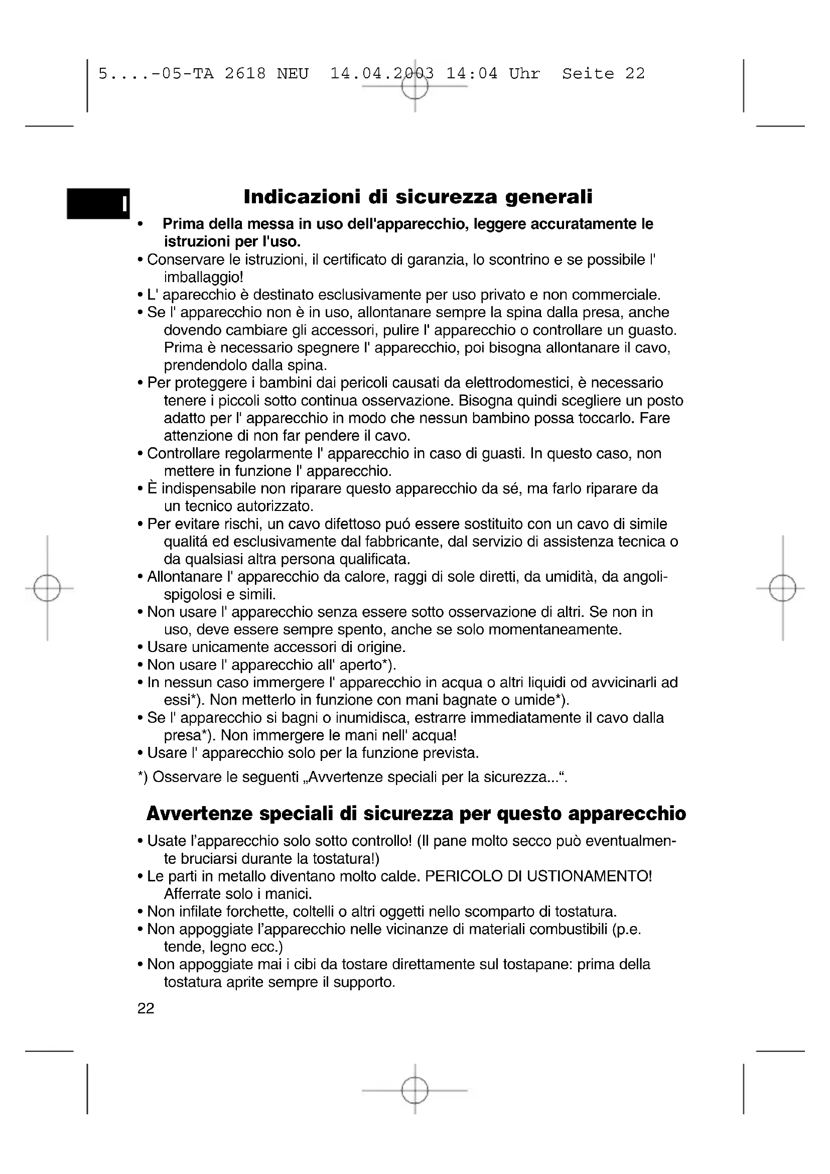 5....-05-TA 2618 NEU 14.04.2003 14:04 Uhr Seite 23Questo apparecchio corrisponde alle norme CE per i disturbi radio e la sicurezza contro le correnti a basso voltaggio ed è stato costruito in base alle più recenti norme tecniche di sicurezza. Con riserva di apportare modifiche tecniche. Garanzia A partire dalla data di acquisto, questo prodotto è garantito dal produttore per un periodo di 24 mesi (scontrino). Durante la durata della garanzia, il produttore eliminerà gratuitamente difetti dell'- apparecchio dovuti a imperfezioni di produzione o di materiale, eventualmente cam- biando l' unità oppure procedendo con le dovute riparazioni. La garanzia è valida solo con lo scontrino. Senza l' esibizione dello scontrino non è possibile fare svolgere le riparazioni gratuitamente. In caso di riparazioni con garanzia, è necessario ritornare al produttore l' appa- recchio intero, nell'imballaggio originale, accompagnato dallo scontrino. In caso di rottura di vetro e difetti agli accessori, i pezzi necessari verranno spediti in cambio gratuitamente. In questo caso è necessario di non spedire l' intero appa- recchio, ma ordinare solo l' accessorio difettoso! Pulizia, manutenzione e scambio non fanno parte della garanzia e sono perciò sono soggetti a spese. La garanzia perde la sua validità se l'apparecchio è sottomesso all' intervento di terzi. Dopo la garanzia Quando la garanzia è scaduta, le riparazioni devono essere effettuate da un nego- zio od un servizio specializzato, contro pagamento.