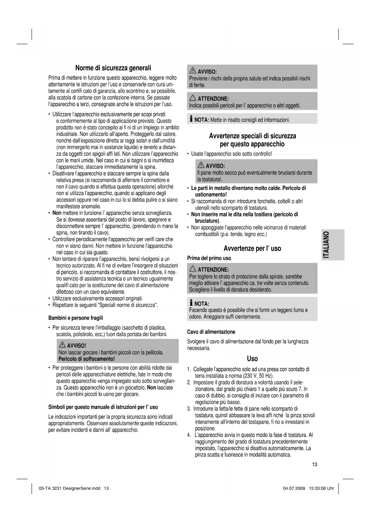 - Estrarre il cassetto per bricciole tirandolo per il manico, eliminare resti di pane ed inserire nuovamente il cassetto. Dati tecnici Modello: ............................................................................ TA 3231 Alimentazione rete: ............................................220-240 V, 50 Hz Consumo di energia: ....................................................720-850 W Classe di protezione: .................................................................... Ι Peso netto: ......................................................................... 1,30 kg Questo apparecchio è stato controllato sulla base di tutte le direttive CE attuali in vigore in questo settore, quali per esempio la normativa in materia di compatibilità elettromagnetica e la direttiva in materia di bassa tensione, ed è stato costruito conformemente alle norme di sicurezza più moderne. Con riserva di apportare modifi che tecniche. Signifi cato del simbolo „Eliminazione“ Salvaguardare l’ ambiente, gli elettrodomestici non vanno eliminati come rifi uti domestici. Per l’ eliminazione degli elettrodomestici, fare uso dei posti di raccolta previsti per questo tipo e porre quegli elettrodomestici che non sono più in uso. Si contribuisce così ad evitare un effetto potenziale sull’ ambien- te e sulla salute, dovuto magari ad una eliminazione sbagliata. Questo signifi ca un contributo personale alla riutilizzazione, al riciclaggio e altre forme di utilizzazione di elettrodomestici ed apparecchi elettronici usati. Si possono trovare le corrispondenti informazioni sugli appositi luoghi di raccolta, nelle amministrazioni dei comuni. 05-TA 3231 DesignerSerie.indd 1405-TA 3231 DesignerSerie.indd 14 04.07.2008 15:33:08 Uhr04.07.2008 15:33:08 Uhr15 NORSK NORSK Generelle sikkerhetsanvisninger Les nøye gjennom bruksanvisningen før du tar apparatet i bruk. Ta godt vare på bruksanvisningen, garantibeviset, kassalappen og helst også esken med innvendig emballasje. Gis apparatet videre til en tredjeperson, må bruksanvisningen også følge med.