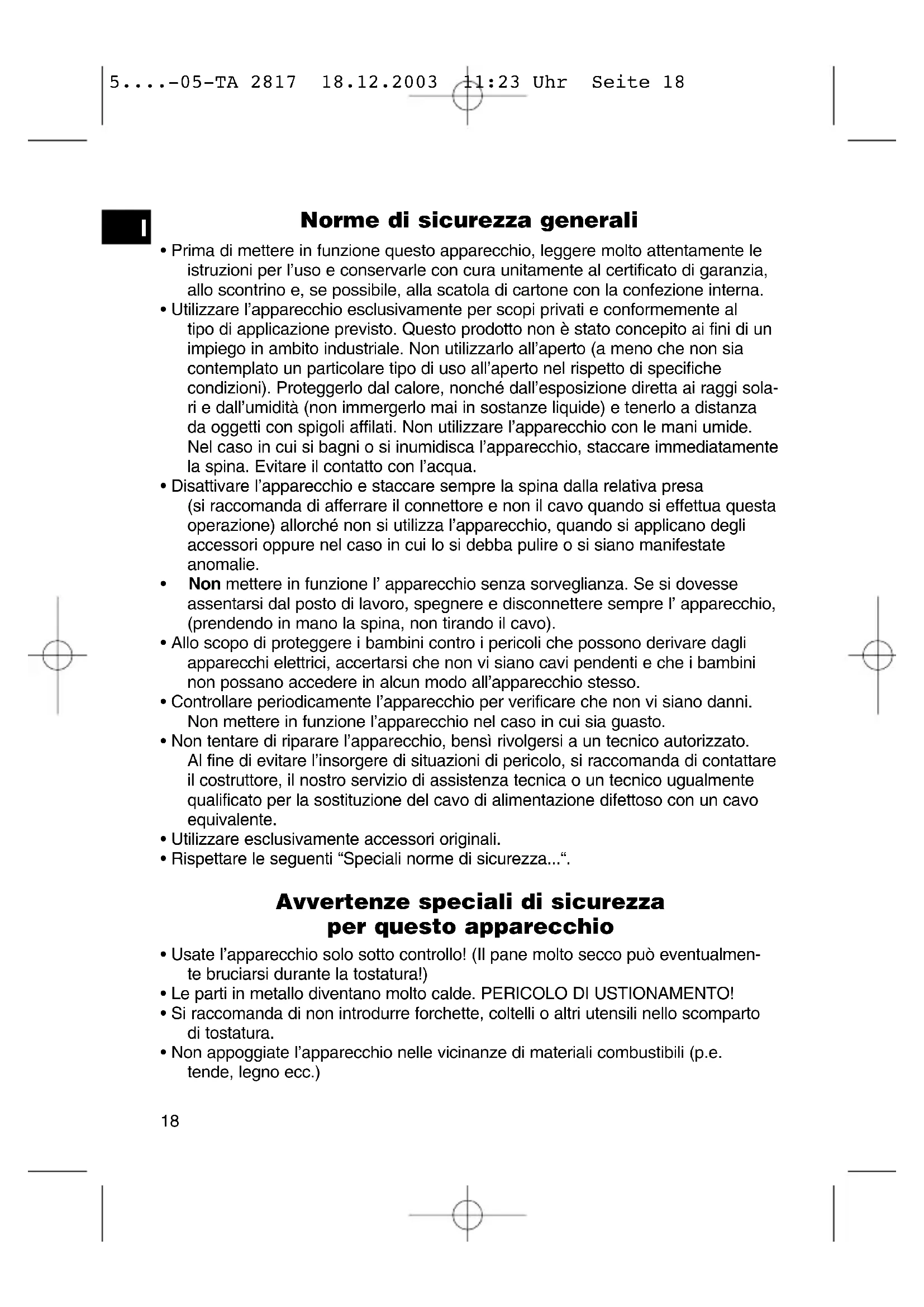 Rispettare le seguente "Speciali norme di sicurezza...".