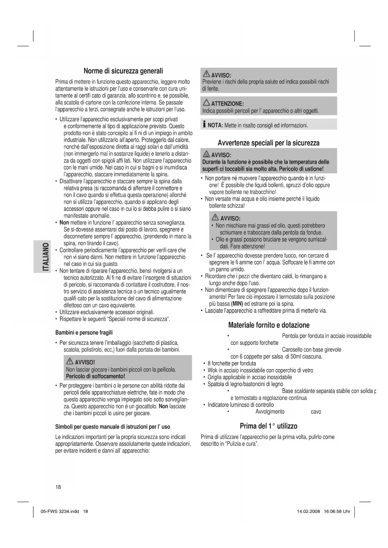 - Avvolgimento cavo Prima del 1° utilizzo Prima di utilizzare l’apparecchio per la prima volta, pulirlo come descritto in “Pulizia e cura”. 05-FWS 3234.indd 1805-FWS 3234.indd 18 14.02.2008 16:06:58 Uhr14.02.2008 16:06:58 Uhr19 ITALIANO ITALIANO ATTENZIONE: Per togliere lo strato di protezione sul supporto di riscaldamen- to, mettere in funzione l’apparecchio per almeno 10 minuti su MAX senza la pentola da fondue. NOTA: Una lieve formazione di fumo è normale. Assicurate che ci sia una buona aerazione. Avvertenze per l’utente