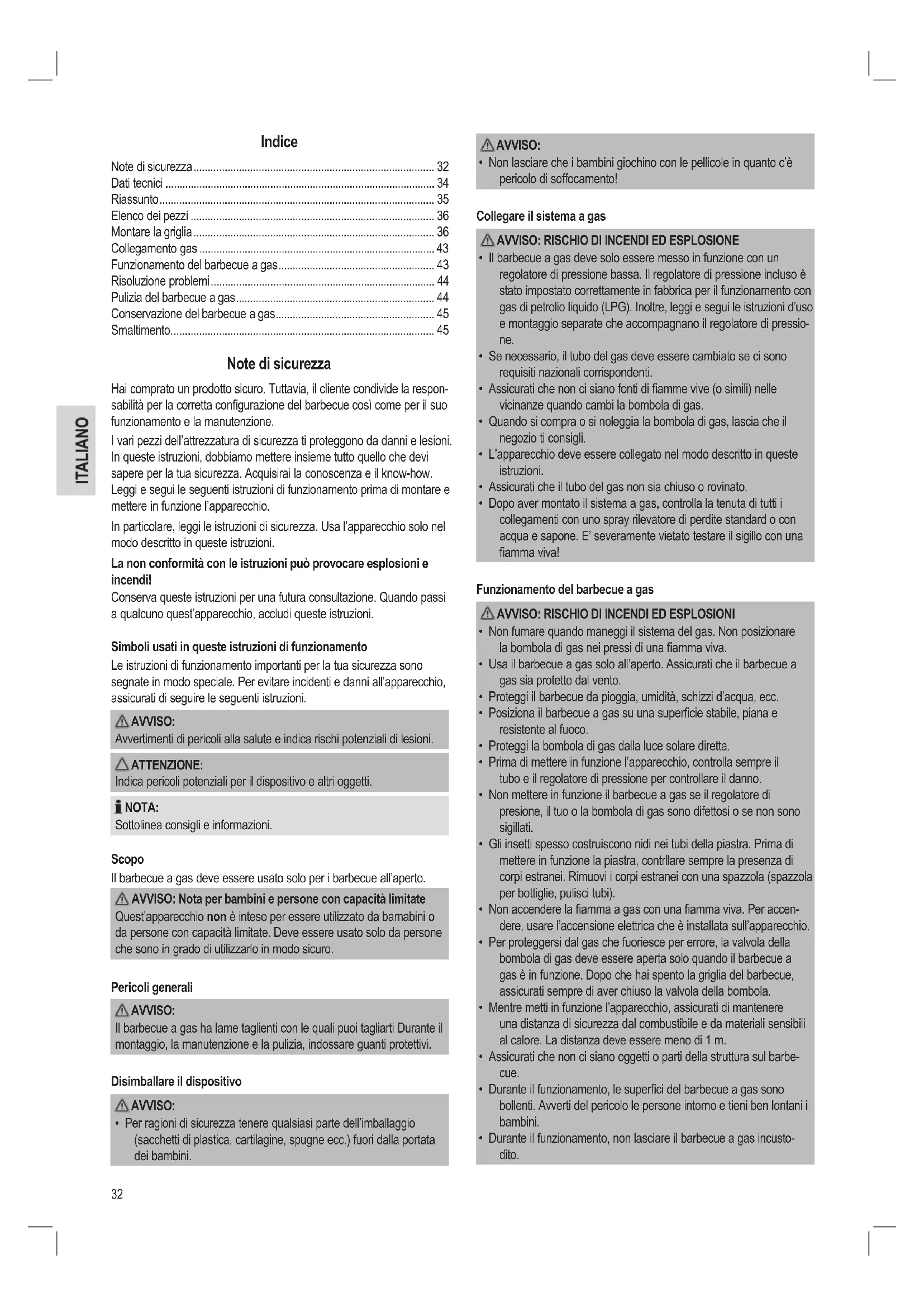 - Ne placez pas la bouteille de gaz à proximité d’une amme nue ou d’autres sources d’allumage. Élimination Emballage L’emballage du produit est constitué principalement de matériaux réutili- sables. Contribuez à la protection de l’environnement ! Déposez les matériaux dans les conteneurs de recyclage prévus à cet effet. Barbecue à gaz À la n de sa durée de vie, ne jetez pas le barbecue à gaz avec les déchets ménagers ! Demandez à votre municipalité ou à une entreprise de recyclage locale quelle est la bonne manière de jeter votre produit. Cet appareil a été testé en conformité avec toutes les directives (CE) EC en vigueur, p. ex. la directive européenne 2009/142/EC sur les appareils à gaz et a été fabriqué conformément aux règlementations de sécurité en cours.32 Indice Note di sicurezza ..................................................................................... 32 Dati tecnici ............................................................................................... 34 Riassunto ................................................................................................. 35 Elenco dei pezzi ...................................................................................... 36 Montare la griglia ..................................................................................... 36 Collegamento gas ................................................................................... 43 Funzionamento del barbecue a gas ....................................................... 43 Risoluzione problemi ............................................................................... 44 Pulizia del barbecue a gas ...................................................................... 44 Conservazione del barbecue a gas ........................................................ 45 Smaltimento. ............................................................................................ 45 Note di sicurezza Hai comprato un prodotto sicuro. Tuttavia, il cliente condivide la respon- sabilità per la corretta congurazione del barbecue così come per il suo funzionamento e la manutenzione. I vari pezzi dell’attrezzatura di sicurezza ti proteggono da danni e lesioni. In queste istruzioni, dobbiamo mettere insieme tutto quello che devi sapere per la tua sicurezza. Acquisirai la conoscenza e il know-how. Leggi e segui le seguenti istruzioni di funzionamento prima di montare e mettere in funzione l’apparecchio. In particolare, leggi le istruzioni di sicurezza. Usa l’apparecchio solo nel modo descritto in queste istruzioni. La non conformità con le istruzioni può provocare esplosioni e incendi! Conserva queste istruzioni per una futura consultazione. Quando passi a qualcuno quest’apparecchio, accludi queste istruzioni. Simboli usati in queste istruzioni di funzionamento Le istruzioni di funzionamento importanti per la tua sicurezza sono segnate in modo speciale. Per evitare incidenti e danni all’apparecchio, assicurati di seguire le seguenti istruzioni. AVVISO: Avvertimenti di pericoli alla salute e indica rischi potenziali di lesioni. ATTENZIONE: Indica pericoli potenziali per il dispositivo e altri oggetti. NOTA: Sottolinea consigli e informazioni. Scopo Il barbecue a gas deve essere usato solo per i barbecue all’aperto. AVVISO: Nota per bambini e persone con capacità limitate Quest’apparecchio non è inteso per essere utilizzato da bamabini o da persone con capacità limitate. Deve essere usato solo da persone che sono in grado di utilizzarlo in modo sicuro. Pericoli generali AVVISO: Il barbecue a gas ha lame taglienti con le quali puoi tagliarti Durante il montaggio, la manutenzione e la pulizia, indossare guanti protettivi. Disimballare il dispositivo AVVISO: