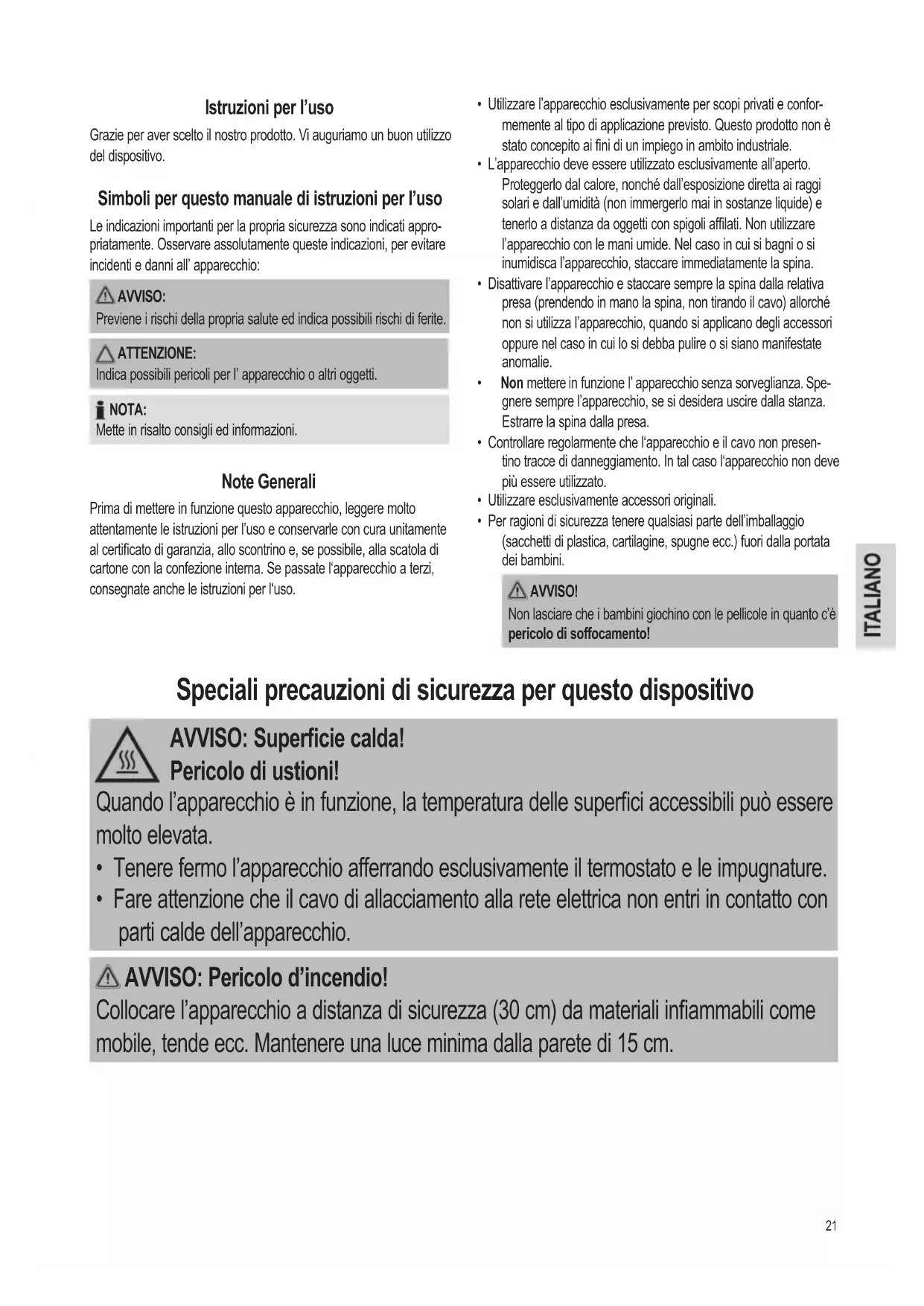 - Per ragioni di sicurezza tenere qualsiasi parte dell’imballaggio (sacchetti di plastica, cartilagine, spugne ecc.) fuori dalla portata dei bambini. AVVISO! Non lasciare che i bambini giochino con le pellicole in quanto c’è pericolo di soffocamento! Speciali precauzioni di sicurezza per questo dispositivo AVVISO: Supercie calda! Pericolo di ustioni! Quando l’apparecchio è in funzione, la temperatura delle superci accessibili può essere molto elevata.