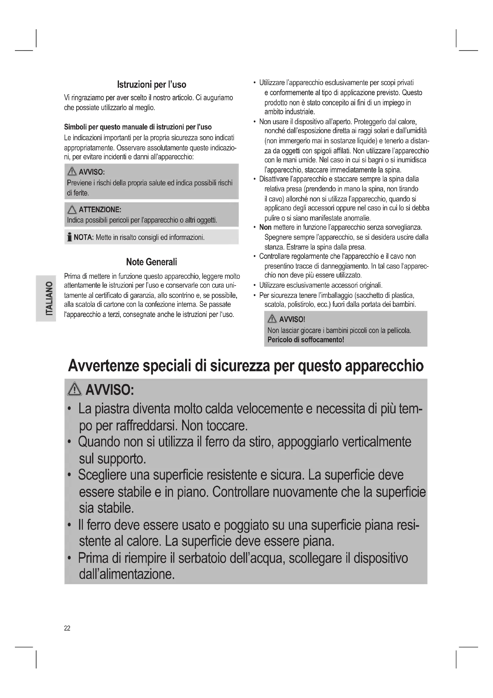 - Quando si accende il ferro o quando esso é in fase di raffredda- mento, tenerlo lontano dalla portata dei bambini più piccoli di 8 anni e più grandi e dalle persone con ridotte capacità siche, sensoriali o mentali o mancanza di esperienza se non sotto la supervisione o dietro istruzioni sull’uso dell’apparecchio in modo sicuro e sui peri- coli connessi all’uso dello stesso apparecchio.