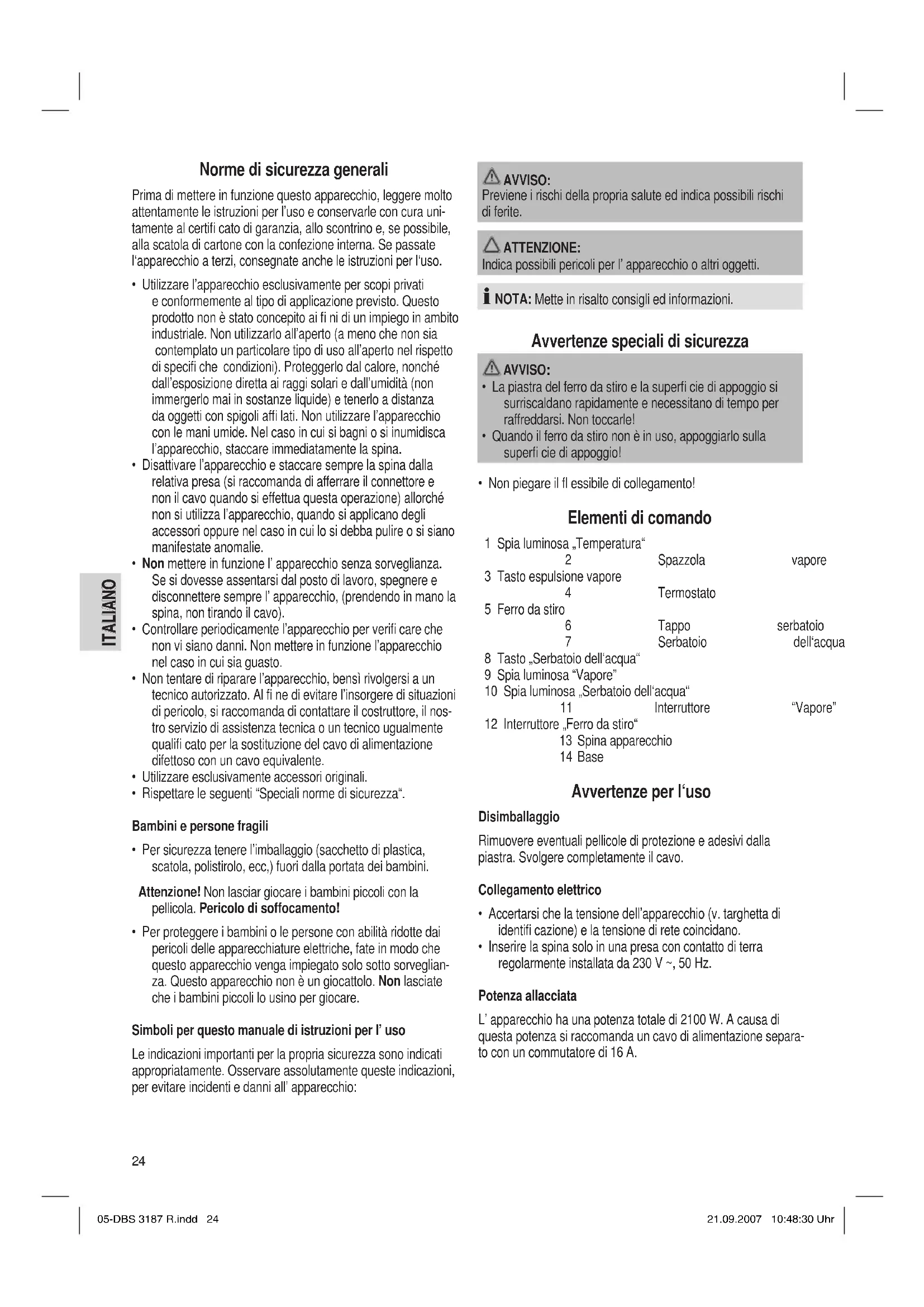 - Inserire la spina solo in una presa con contatto di terra regolarmente installata da 230 V ~, 50 Hz. Potenza allacciata L’ apparecchio ha una potenza totale di 2100 W. A causa di questa potenza si raccomanda un cavo di alimentazione separa- to con un commutatore di 16 A. 05-DBS 3187 R.indd 2405-DBS 3187 R.indd 24 21.09.2007 10:48:30 Uhr21.09.2007 10:48:30 Uhr25 ITALIANO ITALIANO ATTENZIONE: SOVRACCARICO