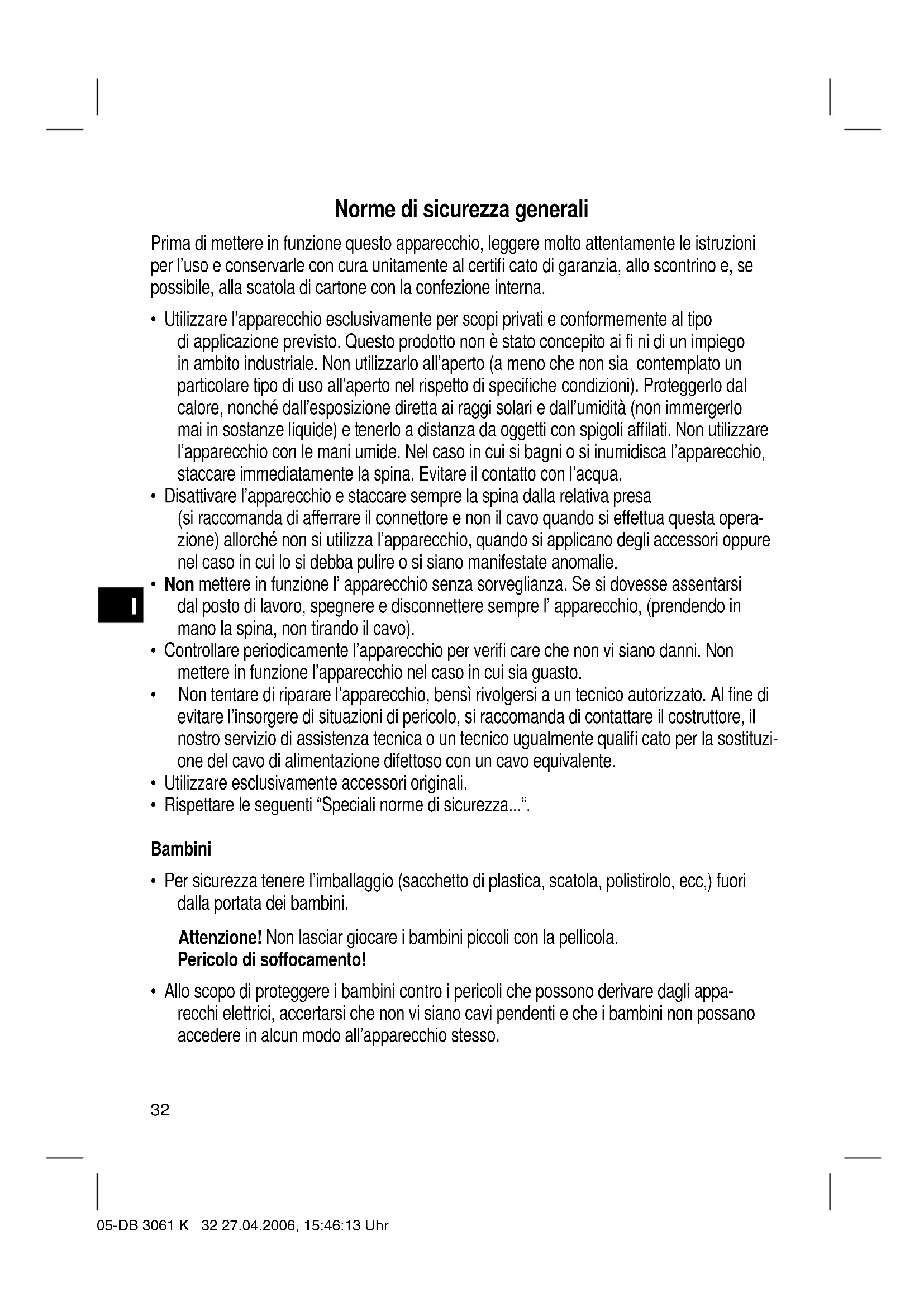 - Allo scopo di proteggere i bambini contro i pericoli che possono derivare dagli appa- recchi elettrici, accertarsi che non vi siano cavi pendenti e che i bambini non possano accedere in alcun modo all’apparecchio stesso. 05-DB 3061 K 32 27.04.2006, 15:46:13 UhrI