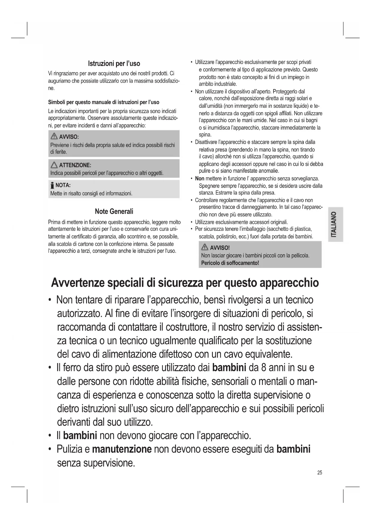 - Il ferro da stiro può essere utilizzato dai bambini da 8 anni in su e dalle persone con ridotte abilità siche, sensoriali o mentali o man- canza di esperienza e conoscenza sotto la diretta supervisione o dietro istruzioni sull’uso sicuro dell’apparecchio e sui possibili pericoli derivanti dal suo utilizzo.