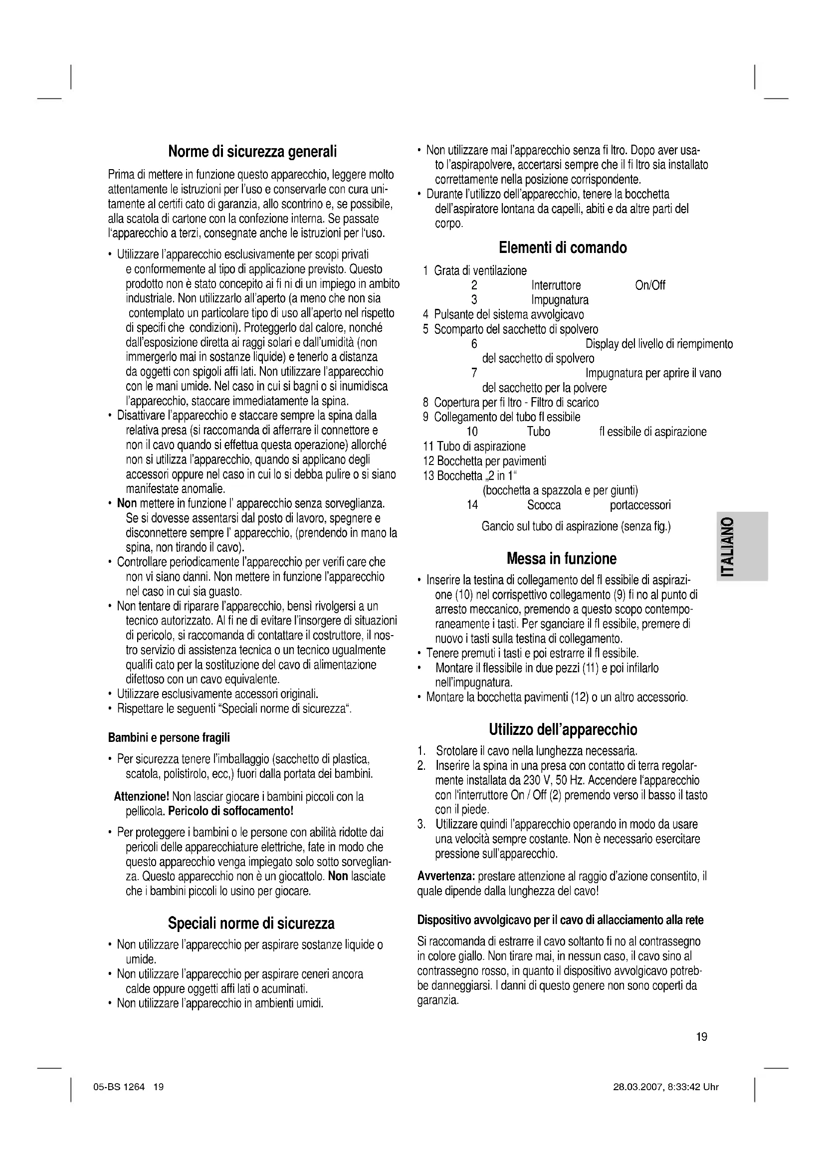 Possibile causa: I fi ltri sono sporchi. Rimedio: Pulire gli elementi. Possibile causa: Nel fl essibile o nell’ugello si trova un oggetto. Rimedio: Controllare gli accesori in caso di otturazioni dovute ad oggetti. 05-BS 1264 20 28.03.2007, 8:33:44 Uhr21 ITALIANO ITALIANO Dati tecnici Modello:............................................................................BS 1264 Alimentazione rete: .......................................220-240 V, 50/60 Hz Consumo di energia:
