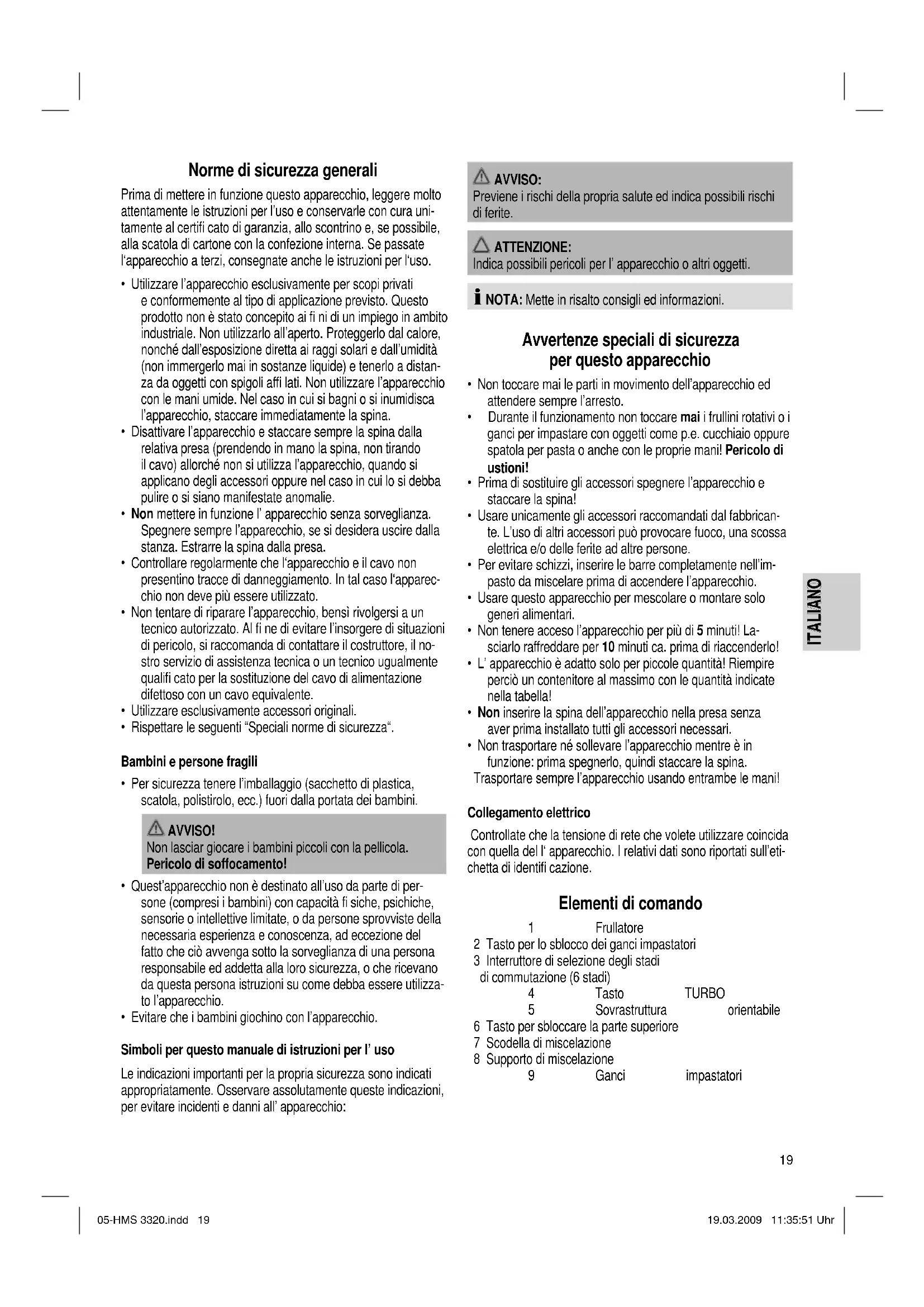 - Non trasportare né sollevare l’apparecchio mentre è in funzione: prima spegnerlo, quindi staccare la spina. Trasportare sempre l’apparecchio usando entrambe le mani! Collegamento elettrico Controllate che la tensione di rete che volete utilizzare coincida con quella del l‘ apparecchio. I relativi dati sono riportati sull’eti- chetta di identifi cazione. Elementi di comando 1 Frullatore 2 Tasto per lo sblocco dei ganci impastatori 3 Interruttore di selezione degli stadi di commutazione (6 stadi) 4 Tasto TURBO 5 Sovrastruttura orientabile 6 Tasto per sbloccare la parte superiore 7 Scodella di miscelazione 8 Supporto di miscelazione 9 Ganci impastatori 05-HMS 3320.indd 1905-HMS 3320.indd 19 19.03.2009 11:35:51 Uhr19.03.2009 11:35:51 Uhr20 ITALIANO ITALIANO Funzionamento rapido (turbo) Per passare in breve tempo al numero massimo di giri. Pre- mendo a brevi intervalli potete lavorare con il funzionamento ad impulsi. ATTENZIONE: non utilizzate questa funzione per più di 1 minuto. Uso dei ganci impastatori/bracci agitatori