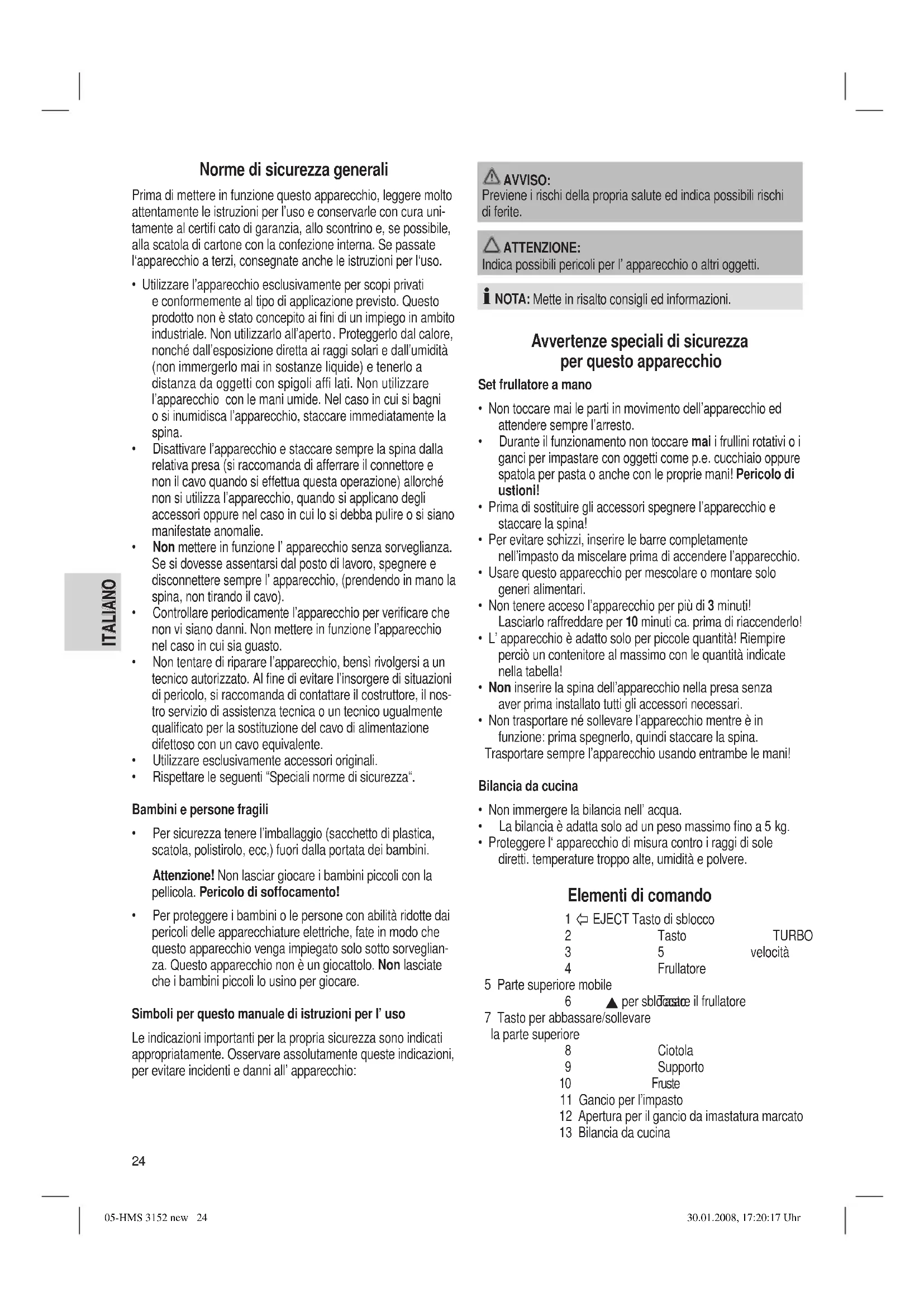 000 g ( 0.35oz-175oz) Questo apparecchio è stato controllato sulla base di tutte le direttive CE attuali in vigore in questo settore, quali per esempio la normativa in materia di compatibilità elettromagnetica e la direttiva in materia di bassa tensione, ed è stato costruito conformemente alle norme di sicurezza più moderne. Con riserva di apportare modifi che tecniche. Garanzia Per l’apparecchio da noi messo in commercio ci assumiamo una garanzia di 24 mesi dalla data di acquisto (scontrino). Durante la garanzia noi ci impegniamo ad eliminare gratuita- mente i guasti dell’apparecchio o degli accessori, dovuti a difetti di materiale o di fabbricazione, riparandoli o, a nostra discrezio- ne, sostituendoli. Le prestazioni in garanzia danno luogo a una proroga della garanzia né danno diritto ad una nuova garanzia! Per la garanzia è suffi ciente lo scontrino di acquisto. Senza questo scontrino non sussiste il diritto né ad una sostituzione né ad una riparazione gratuita. Nel caso si ricorra alla garanzia, restituire al rivenditore l’apparecchio completo in ogni sua parte, nell’imballaggio originale unitamente allo scontrino. La riparazione di pezzi d’uso ovvero soggetti a logoramento come anche operazioni di pulizia e manutenzione o la sostituzio- ne di pezzi soggetti a logoramento non rientrano nella garanzia e quindi sono a pagamento! La garanzia si annulla nel caso di intervento da parte di terzi. Dopo la garanzia Al termine della garanzia le riparazioni possono essere eseguite deitro pagamento dal corrispettivo negozio specializzato o servizio riparazioni. Signifi cato del simbolo „Eliminazione“ Salvaguardare l’ ambiente, gli elettrodomestici non vanno eliminati come rifi uti domestici. Per l’ eliminazione degli elettrodomestici, fare uso dei posti di raccolta previsti per questo tipo e porre quegli elettrodomestici che non sono più in uso. Si contribuisce così ad evitare un effetto potenziale sull’ ambien- te e sulla salute, dovuto magari ad una eliminazione sbagliata. Questo signifi ca un contributo personale alla riutilizzazione, al riciclaggio e altre forme di utilizzazione di elettrodomestici ed apparecchi elettronici usati. Si possono trovare le corrispondenti informazioni sugli appositi luoghi di raccolta, nelle amministrazioni dei comuni. 05-HMS 3152 new 27 30.01.2008, 17:20:24 Uhr28 NORSK NORSK Generelle sikkerhetsanvisninger Les nøye gjennom bruksanvisningen før du tar apparatet i bruk. Ta godt vare på bruksanvisningen, garantibeviset, kassalappen og helst også esken med innvendig emballasje. Gis apparatet videre til en tredjeperson, må bruksanvisningen også følge med.