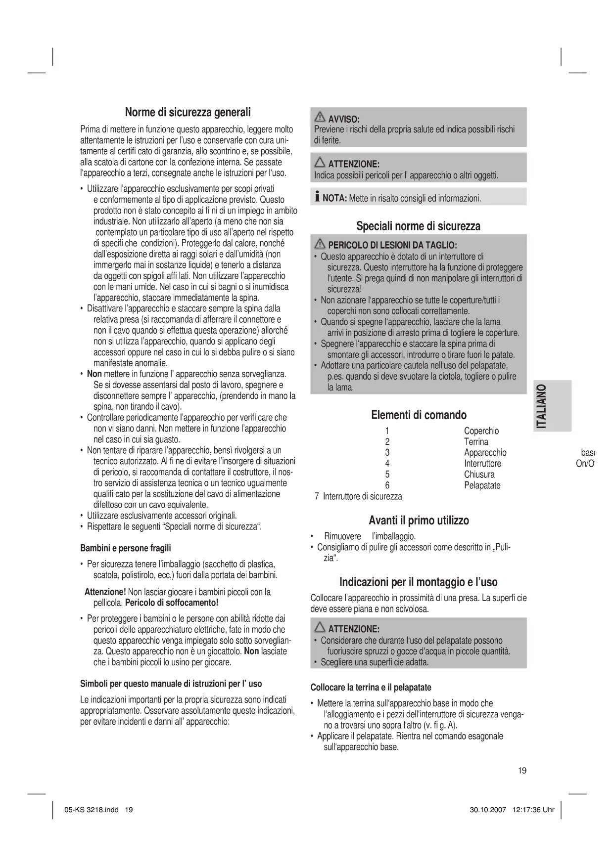 - Applicare il pelapatate. Rientra nel comando esagonale sull‘apparecchio base. 05-KS 3218.indd 1905-KS 3218.indd 19 30.10.2007 12:17:36 Uhr30.10.2007 12:17:36 Uhr20 ITALIANO ITALIANO Versare acqua e patate