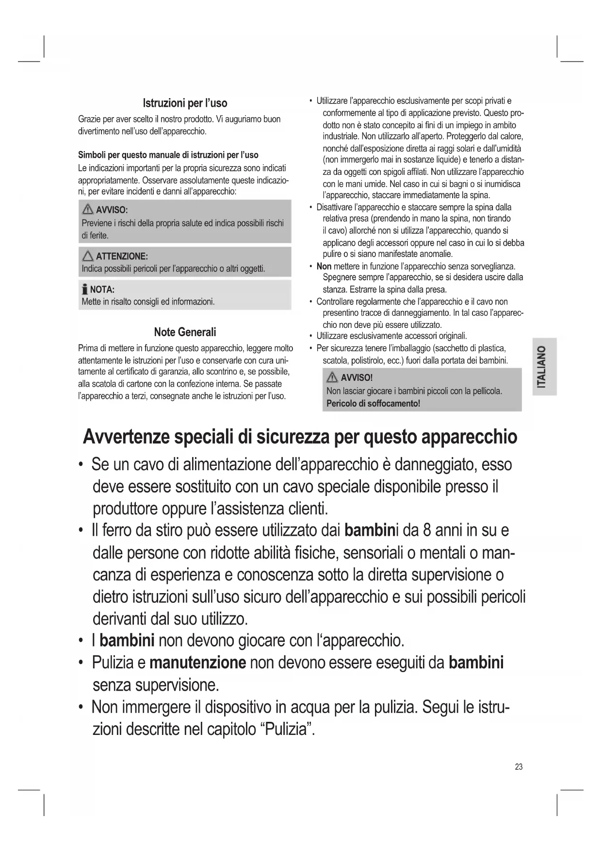 - Pulizia e manutenzione non devono essere eseguiti da bambini senza supervisione.