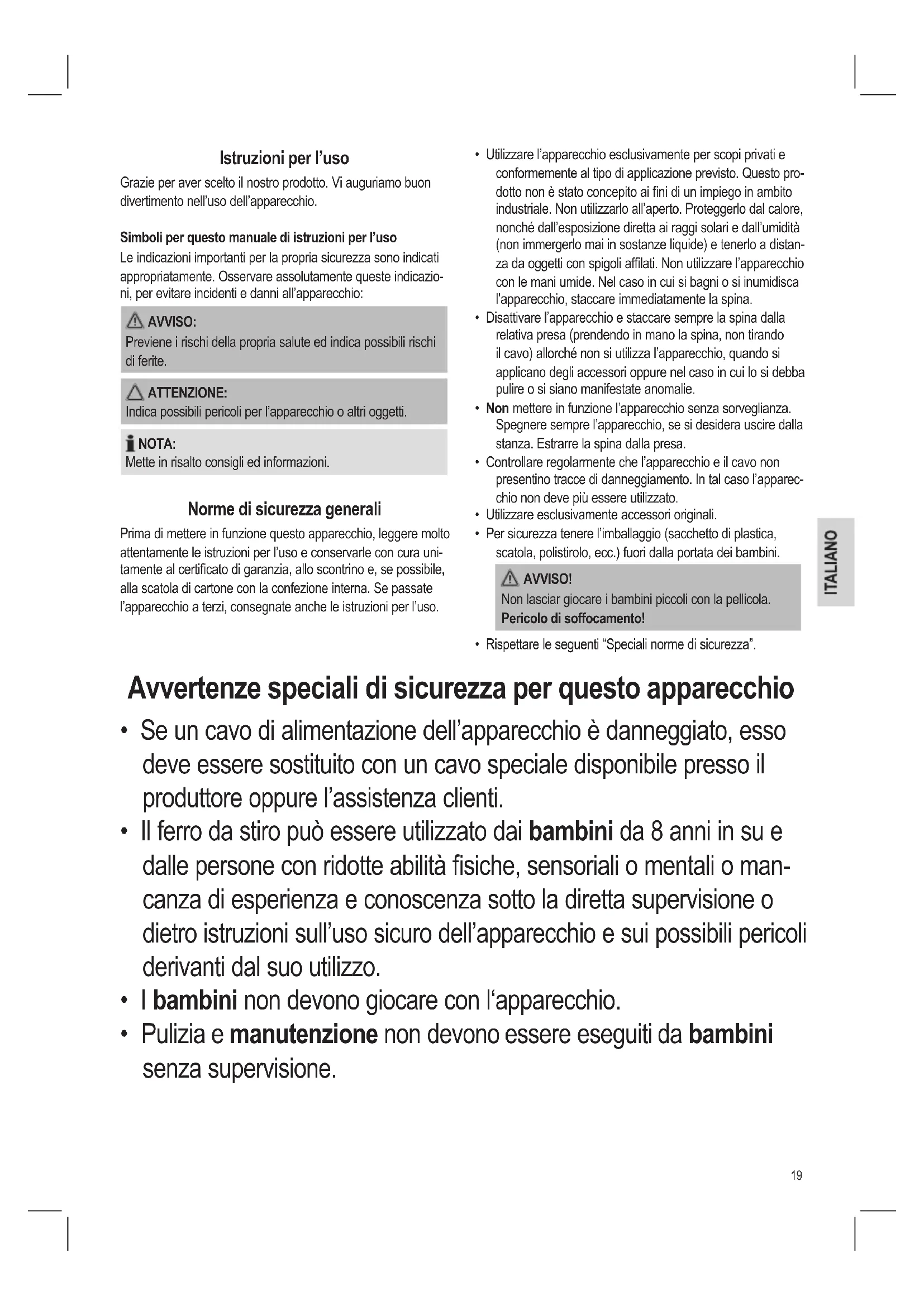 - Il ferro da stiro può essere utilizzato dai bambini da 8 anni in su e dalle persone con ridotte abilità siche, sensoriali o mentali o man- canza di esperienza e conoscenza sotto la diretta supervisione o dietro istruzioni sull’uso sicuro dell’apparecchio e sui possibili pericoli derivanti dal suo utilizzo.