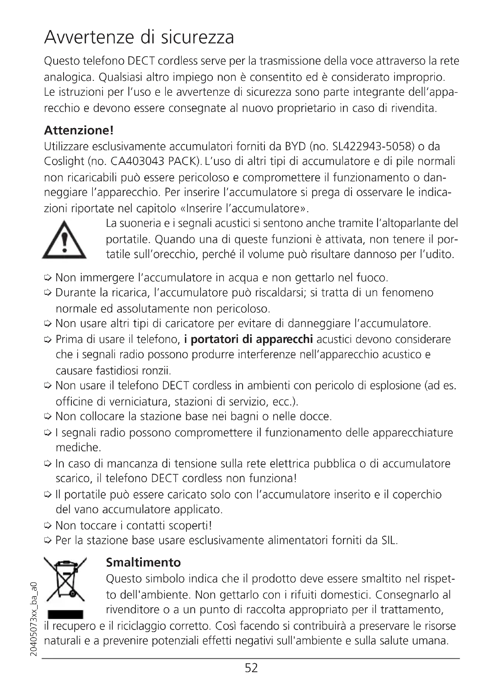 Prima di usare il telefono, i portatori di apparecchi acustici devono considerare che i segnali radio possono produrre interferenze nell’apparecchio acustico e causare fastidiosi ronzii. ➭ Non usare il telefono DECT cordless in ambienti con pericolo di esplosione (ad es. officine di verniciatura, stazioni di servizio, ecc.). ➭ Non collocare la stazione base nei bagni o nelle docce. ➭ I segnali radio possono compromettere il funzionamento delle apparecchiature mediche. ➭ In caso di mancanza di tensione sulla rete elettrica pubblica o di accumulatore scarico, il telefono DECT cordless non funziona! ➭ Il portatile può essere caricato solo con l’accumulatore inserito e il coperchio del vano accumulatore applicato. ➭ Non toccare i contatti scoperti! ➭ Per la stazione base usare esclusivamente alimentatori forniti da SIL. Smaltimento Questo simbolo indica che il prodotto deve essere smaltito nel rispet- to dell'ambiente. Non gettarlo con i rifuiti domestici. Consegnarlo al rivenditore o a un punto di raccolta appropriato per il trattamento, il recupero e il riciclaggio corretto. Così facendo si contribuirà a preservare le risorse naturali e a prevenire potenziali effetti negativi sull'ambiente e sulla salute umana.53 20405073xx_ba_a0 Indice Avvertenze di sicurezza Mettere in funzione il telefono ……………………………………………55 Contenuto dell’imballaggio ………………………………………………55 Luogo di installazione………………………………………………………55 Sicurezza contro le intercettazioni…………………………………………55 Installare la stazione base …………………………………………………56 Collegare il telefono ………………………………………………………56 Inserire l’accumulatore ……………………………………………………57 Caricare l’accumulatore ……………………………………………………57 Conoscere il telefono…………………………………………………………58 Indicazioni sul display, tasti, simboli ………………………………………58 Portatile ……………………………………………………………………59 Tasti del portatile……………………………………………………………60 Stazione di base ……………………………………………………………61 Chiamata collettiva (paging) ………………………………………………61 Portatile alla consegna ……………………………………………………61 Attivare/disattivare il blocco tastiera ………………………………………61 Telefonare………………………………………………………………………62 Telefonare all’esterno ………………………………………………………62 Viva voce ……………………………………………………………………62 Regolare il volume durante la conversazione ……………………………62 Escludere il microfono del portatile ………………………………………62 Disattivare la suoneria………………………………………………………63 Chiamate interne …………………………………………………………63 Consultazione interna ……………………………………………………64 Trasferire una chiamata ……………………………………………………64 Indicazione del numero del chiamante/CLIP ……………………………64 Il telefono Iron è concepito per l’allacciamento alla rete analogica. Leggere attentamente queste istruzioni per conoscere e sfruttare al meglio tutte le funzionalità del telefono Iron. Conservare in ogni caso queste istruzioni!54 20405073xx_ba_a0 Indice Rubrica …………………………………………………………………………65 Inserire una voce nella rubrica/Modificare una voce ……………………65 Selezionare dalla rubrica……………………………………………………65 Cancellare una voce nella rubrica/Cancellare l’intera rubrica……………66 Visualizzare i dettagli ………………………………………………………66 Visualizzare la capacità restante …………………………………………66 Selezioni comfort ……………………………………………………………67 Ripetizione della selezione …………………………………………………67 Elenco chiamate* …………………………………………………………68 Accesso diretto ……………………………………………………………69 Impostazioni……………………………………………………………………70 Audio ………………………………………………………………………70 Display ………………………………………………………………………70 Impostare la data e l’ora …………………………………………………71 Reset ………………………………………………………………………71 Impostare il portatile ………………………………………………………72 Chiamata diretta (Baby Call) ………………………………………………72 Risposta automatica/fine automatica ……………………………………73 Modalità ECO/ECO Mode …………………………………………………73 Lingua di dialogo sul display ………………………………………………73 Impostare la stazione di base ………………………………………………74 Modificare il PIN ……………………………………………………………74 Impostare il volume/la melodia della suoneria base ……………………74 Impostare la modalità di selezione ………………………………………75 Impostare il segnale flash …………………………………………