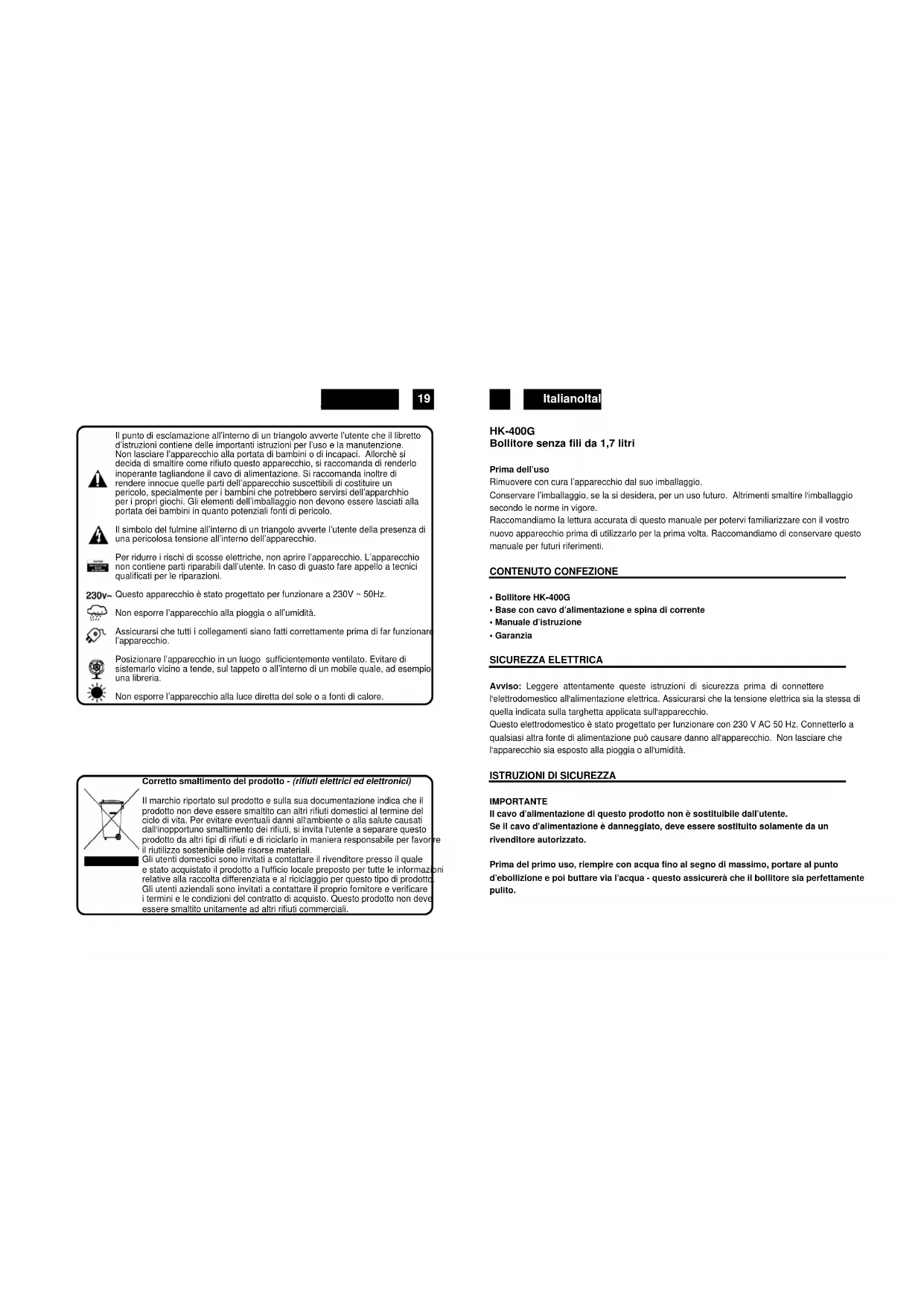 IMPORTANTE Il cavo d'alimentazione di questo prodotto non è sostituibile dall'utente. Se il cavo d'alimentazione è danneggiato, deve essere sostituito solamente da un rivenditore autorizzato. Prima del primo uso, riempire con acqua fino al segno di massimo, portare al punto d'ebollizione e poi buttare via l'acqua - questo assicurerà che il bollitore sia perfettamente pulito. Il punto di esclamazione all’interno di un triangolo avverte l’utente che il libretto d’istruzioni contiene delle importanti istruzioni per l’uso e la manutenzione. Non lasciare l’apparecchio alla portata di bambini o di incapaci. Allorchè si decida di smaltire come rifiuto questo apparecchio, si raccomanda di renderlo inoperante tagliandone il cavo di alimentazione. Si raccomanda inoltre di rendere innocue quelle parti dell’apparecchio suscettibili di costituire un pericolo, specialmente per i bambini che potrebbero servirsi dell’apparchhio per i propri giochi. Gli elementi dell’imballaggio non devono essere lasciati alla portata dei bambini in quanto potenziali fonti di pericolo. Il simbolo del fulmine all’interno di un triangolo avverte l’utente della presenza di una pericolosa tensione all’interno dell’apparecchio. Per ridurre i rischi di scosse elettriche, non aprire l’apparecchio. L’apparecchio non contiene parti riparabili dall’utente. In caso di guasto fare appello a tecnici qualificati per le riparazioni. Questo apparecchio è stato progettato per funzionare a 230V ~ 50Hz. Non esporre l’apparecchio alla pioggia o all’umidità. Assicurarsi che tutti i collegamenti siano fatti correttamente prima di far funzionare l’apparecchio. Posizionare l’apparecchio in un luogo sufficientemente ventilato. Evitare di sistemarlo vicino a tende, sul tappeto o all’interno di un mobile quale, ad esempio, una libreria. Non esporre l’apparecchio alla luce diretta del sole o a fonti di calore. Corretto smaltimento del prodotto - (rifiuti elettrici ed elettronici) II marchio riportato sul prodotto e sulla sua documentazione indica che il prodotto non deve essere smaltito can altri rifiuti domestici al termine del ciclo di vita. Per evitare eventuali danni all'ambiente o alla salute causati dall'inopportuno smaltimento dei rifiuti, si invita l'utente a separare questo prodotto da altri tipi di rifiuti e di riciclarlo in maniera responsabile per favorire il riutilizzo sostenibile delle risorse materiali. Gli utenti domestici sono invitati a contattare il rivenditore presso il quale e stato acquistato il prodotto a l'ufficio locale preposto per tutte le informazioni relative alla raccolta differenziata e al riciclaggio per questo tipo di prodotto. Gli utenti aziendali sono invitati a contattare il proprio fornitore e verificare i termini e le condizioni del contratto di acquisto. Questo prodotto non deve essere smaltito unitamente ad altri rifiuti commerciali.ItalianoItaliano